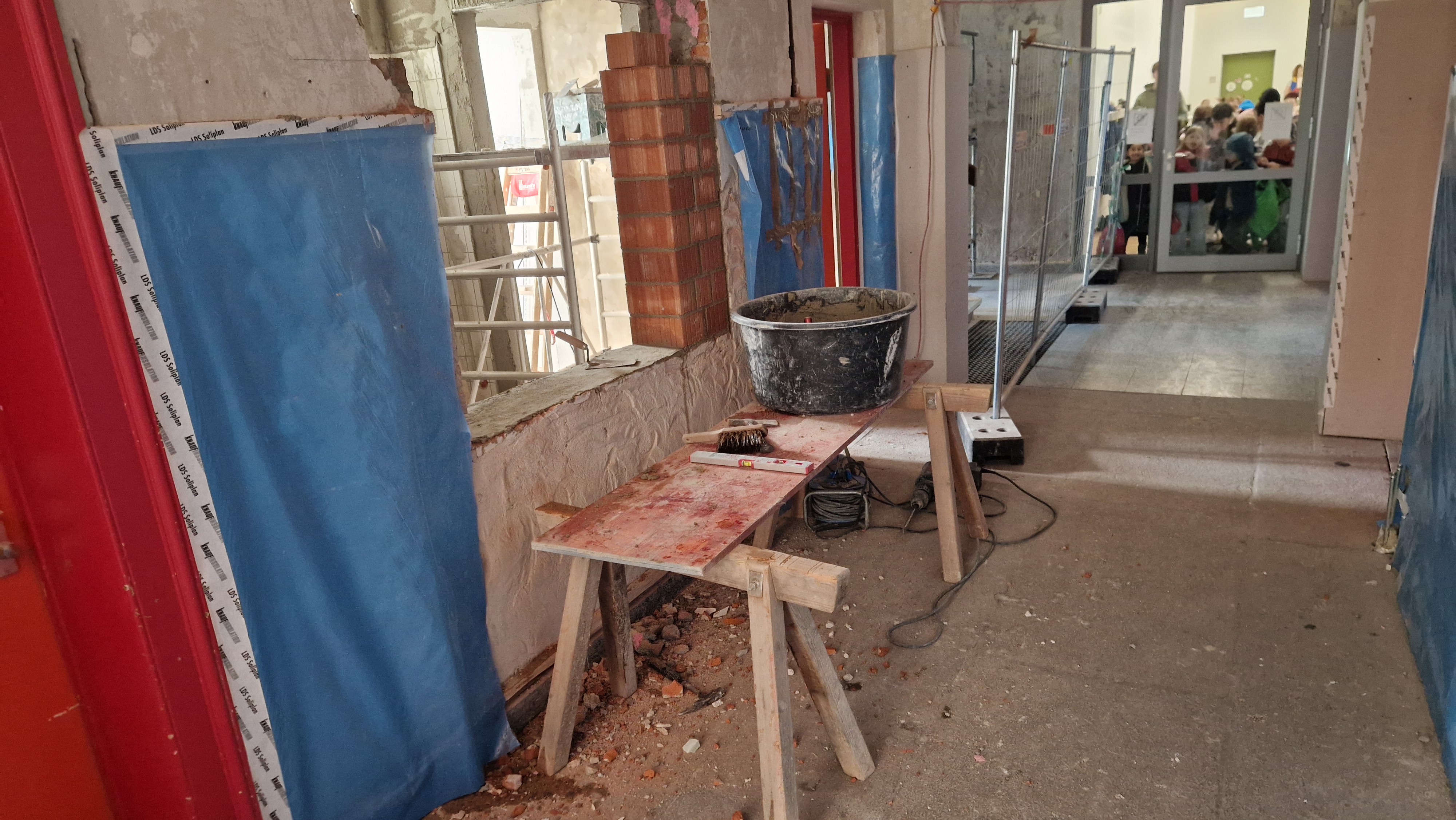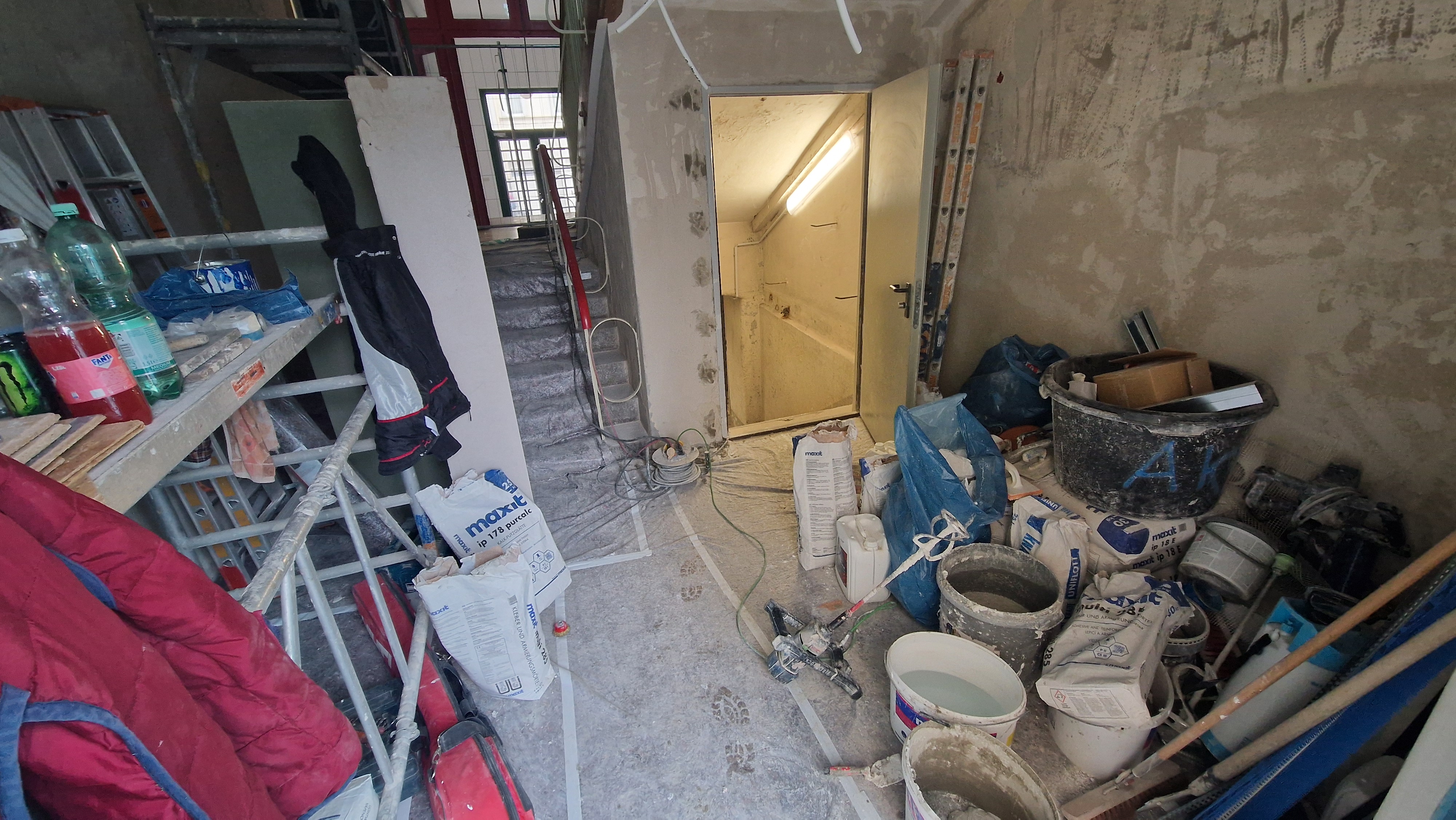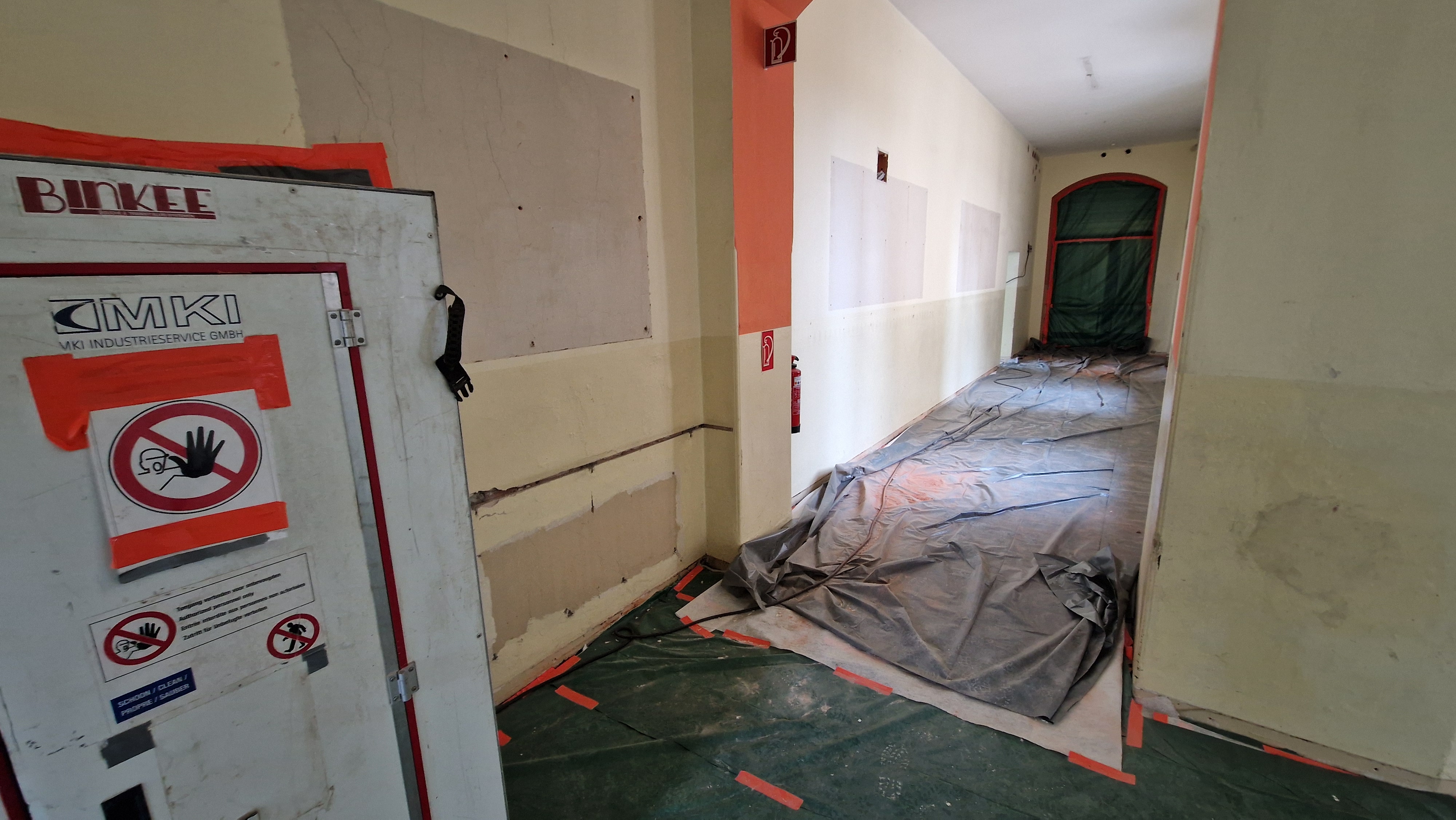 In den Sommerferien werden die Schadstoffe in den Treppenhäusern beseitigt und der neue Aufputz beginnt. Das Betreten des Gebäudes ist vorübergehend nur mit Atemschutzmaske gestattet.