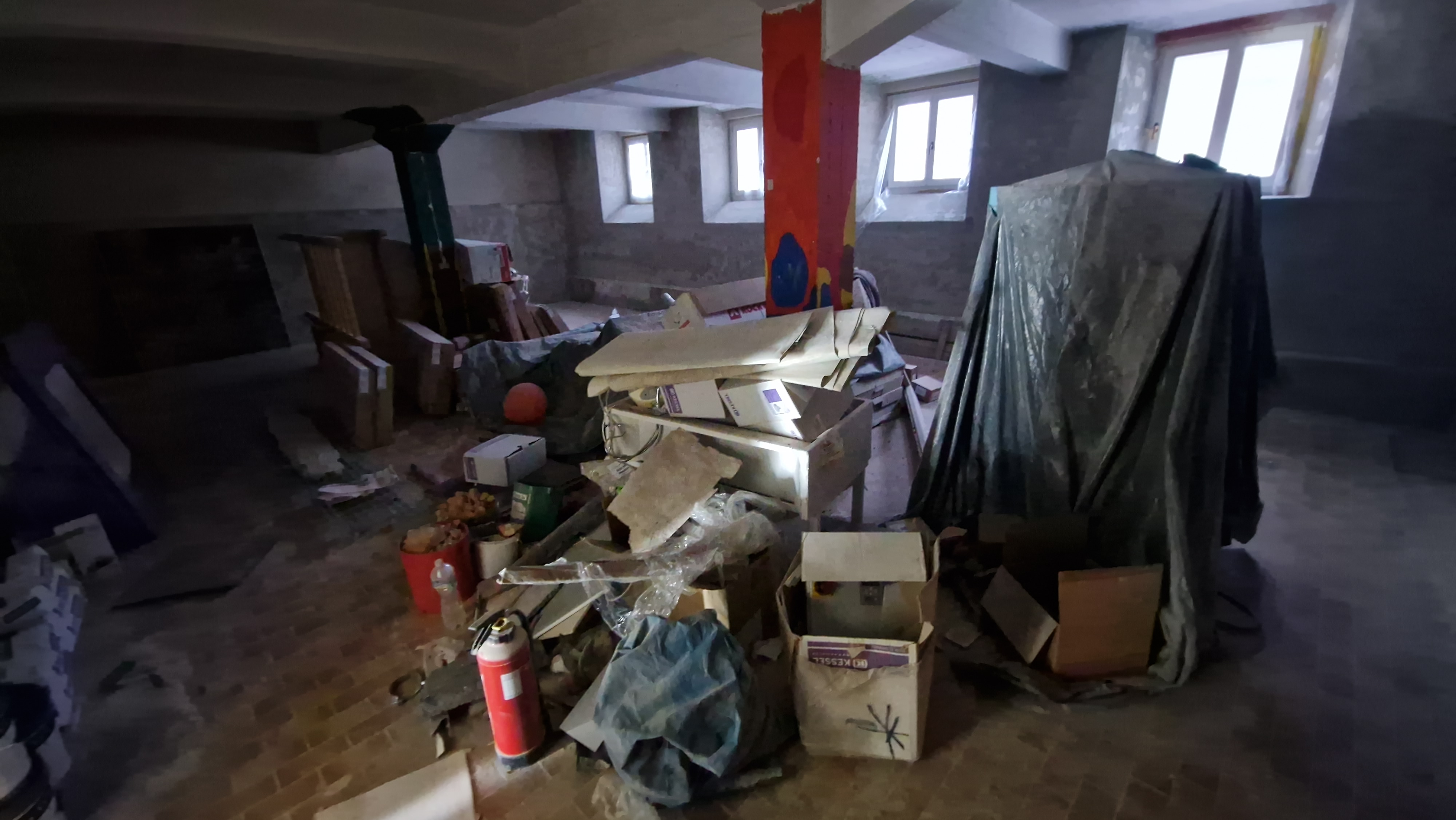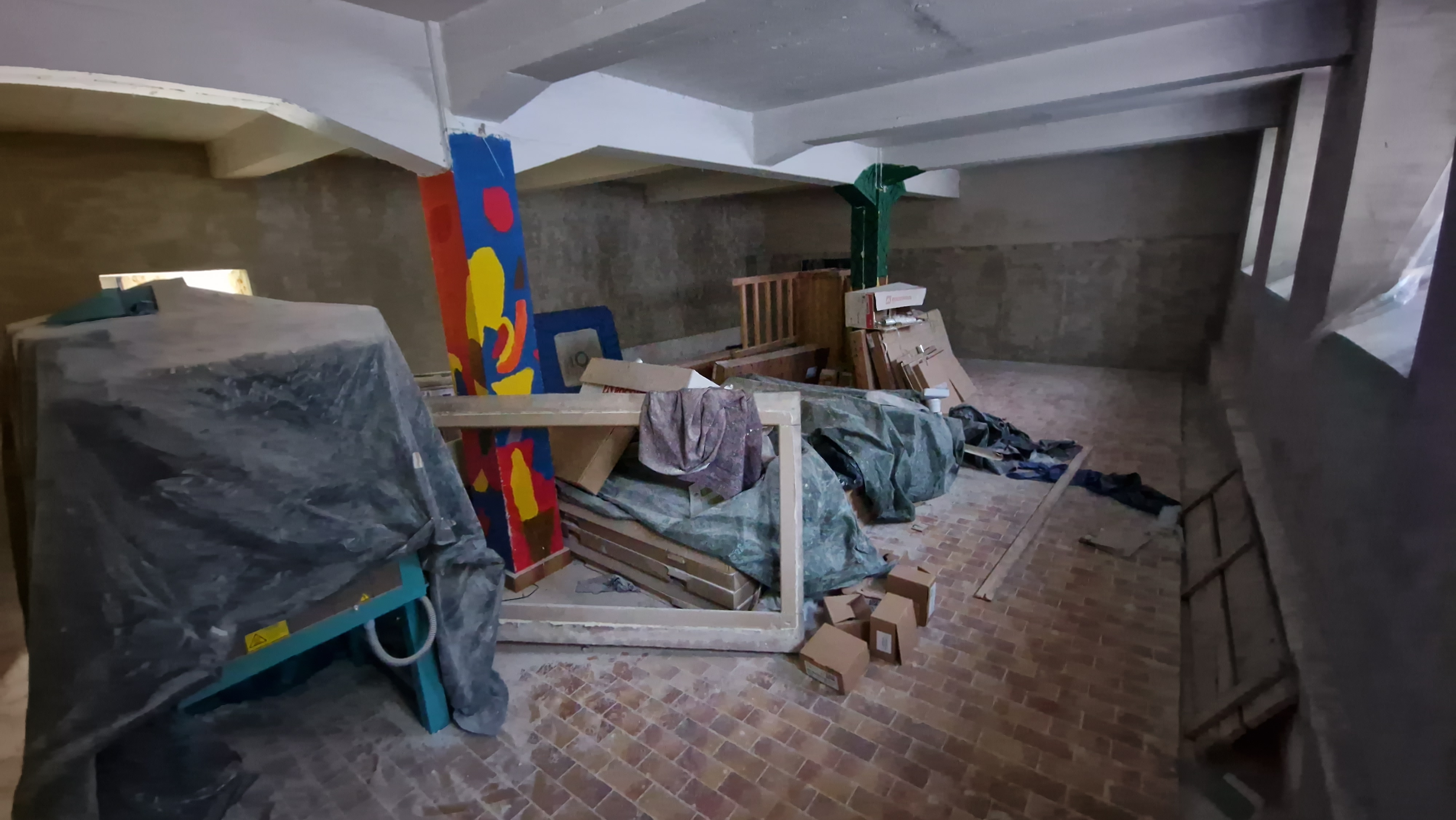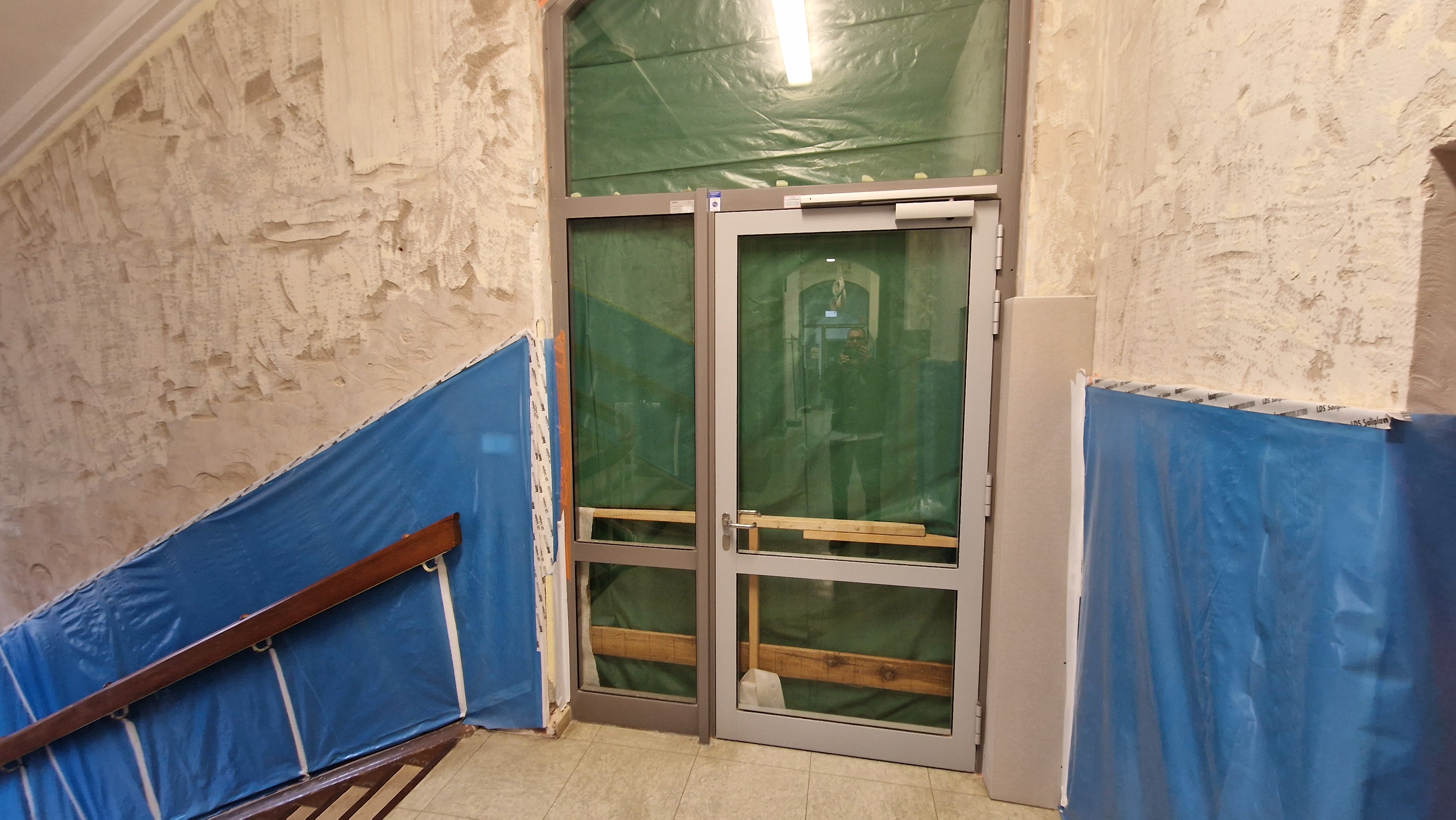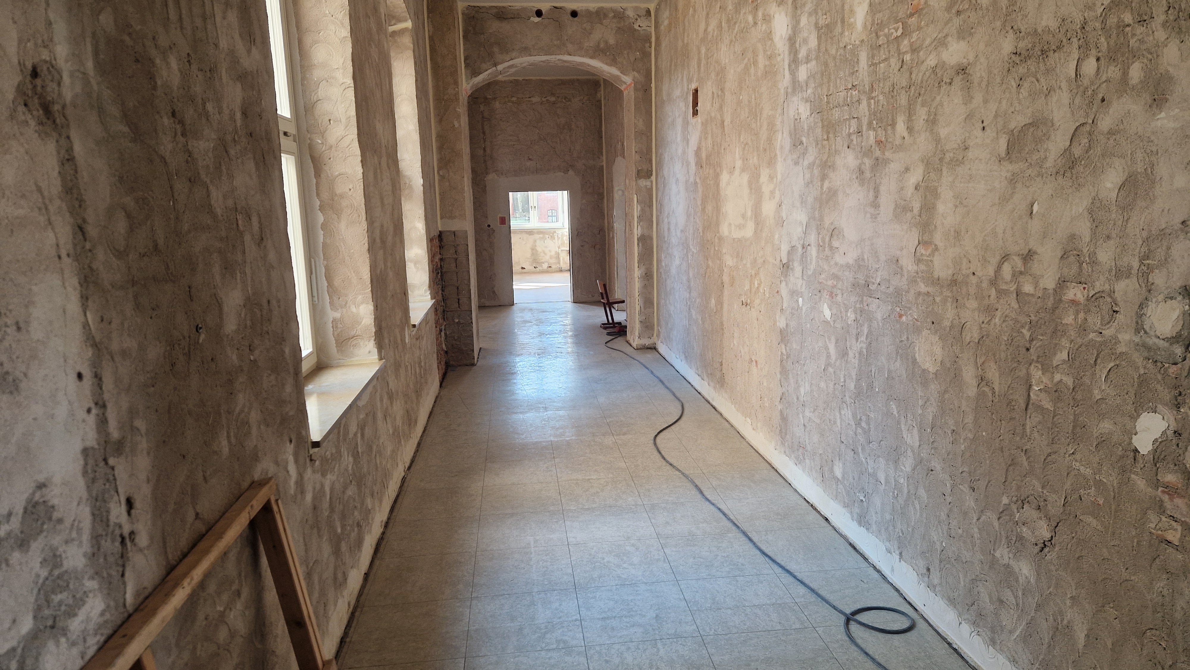 In den Sommerferien werden die Schadstoffe in den Treppenhäusern beseitigt und der neue Aufputz beginnt. Das Betreten des Gebäudes ist vorübergehend nur mit Atemschutzmaske gestattet.