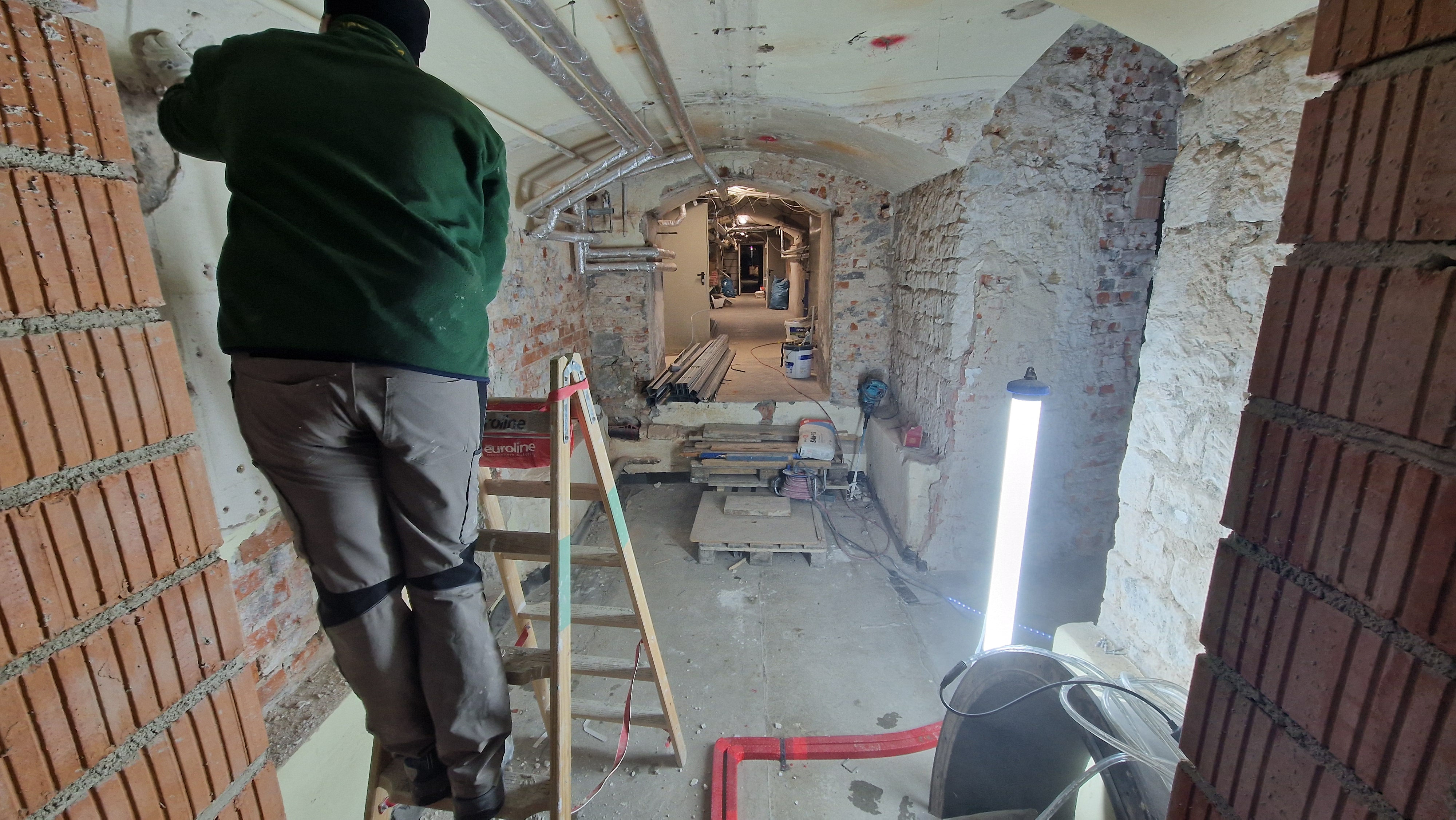 Die Arbeiten beginnen sowohl an der Fassade, wie auch an der Erneuerung des Daches. Im Gebäude werden die sanitären Anlagen im "Jungentrakt" zuerst abgerissen, um anschließend wieder nutzbar gemacht zu werden.