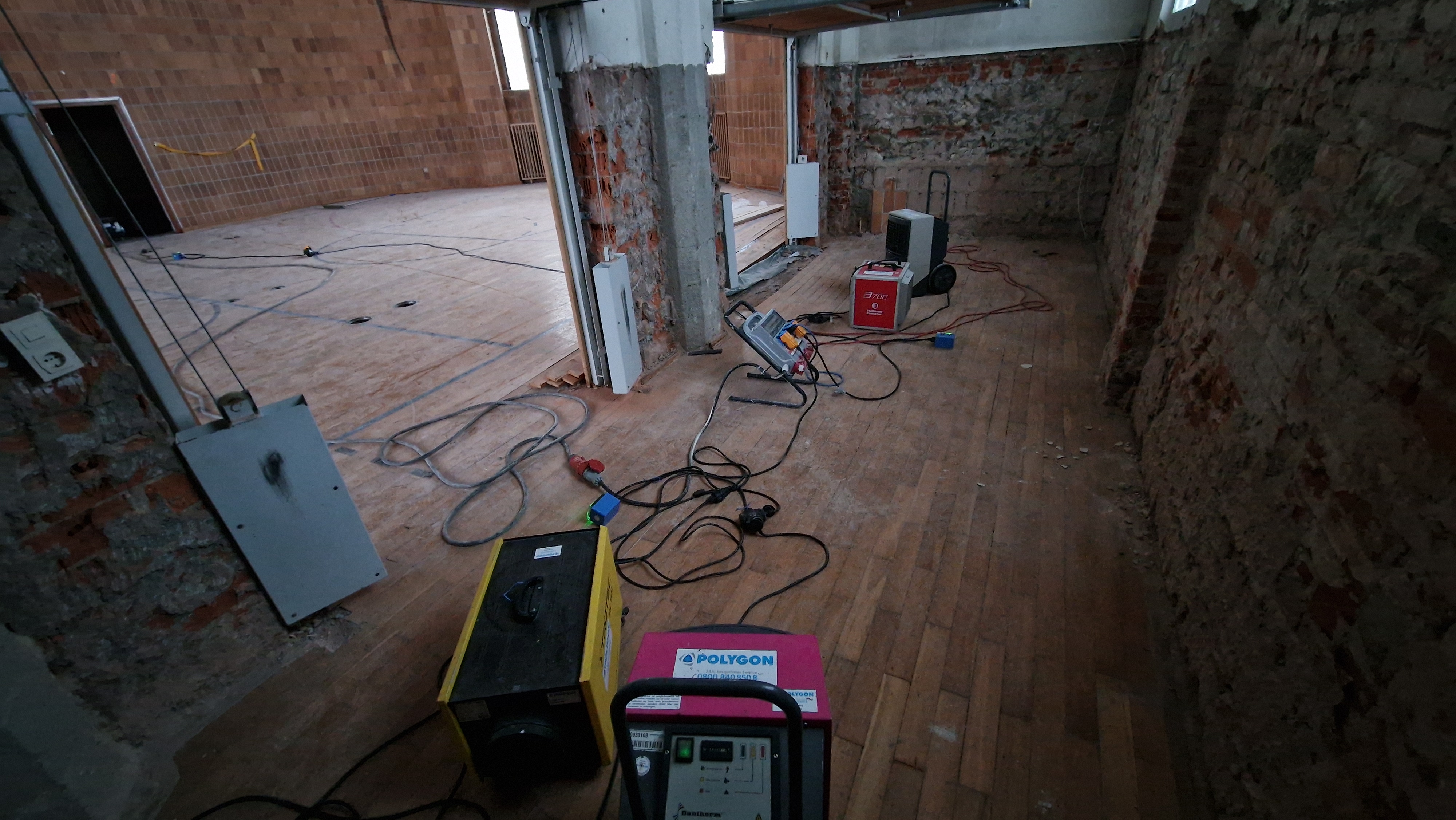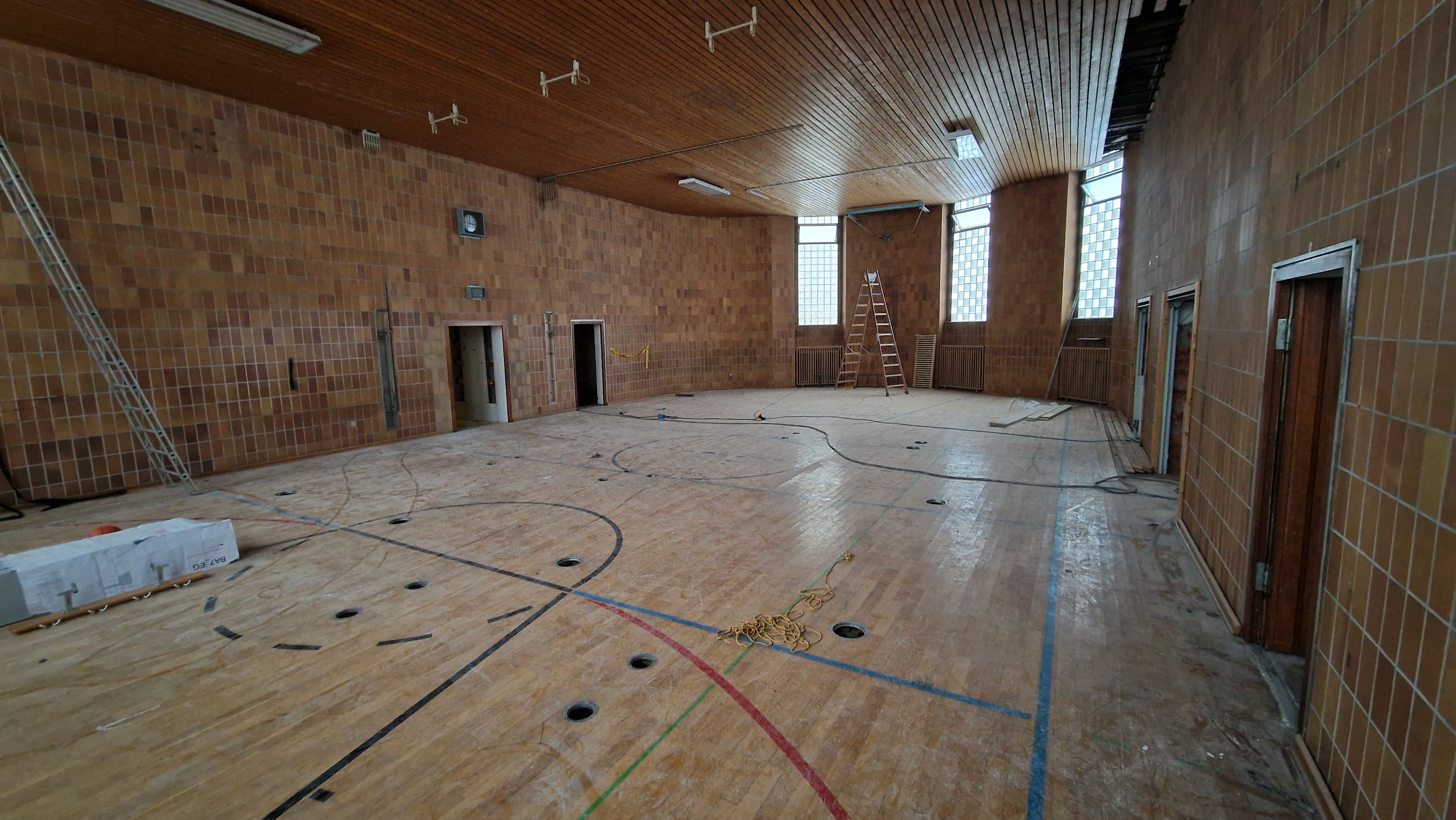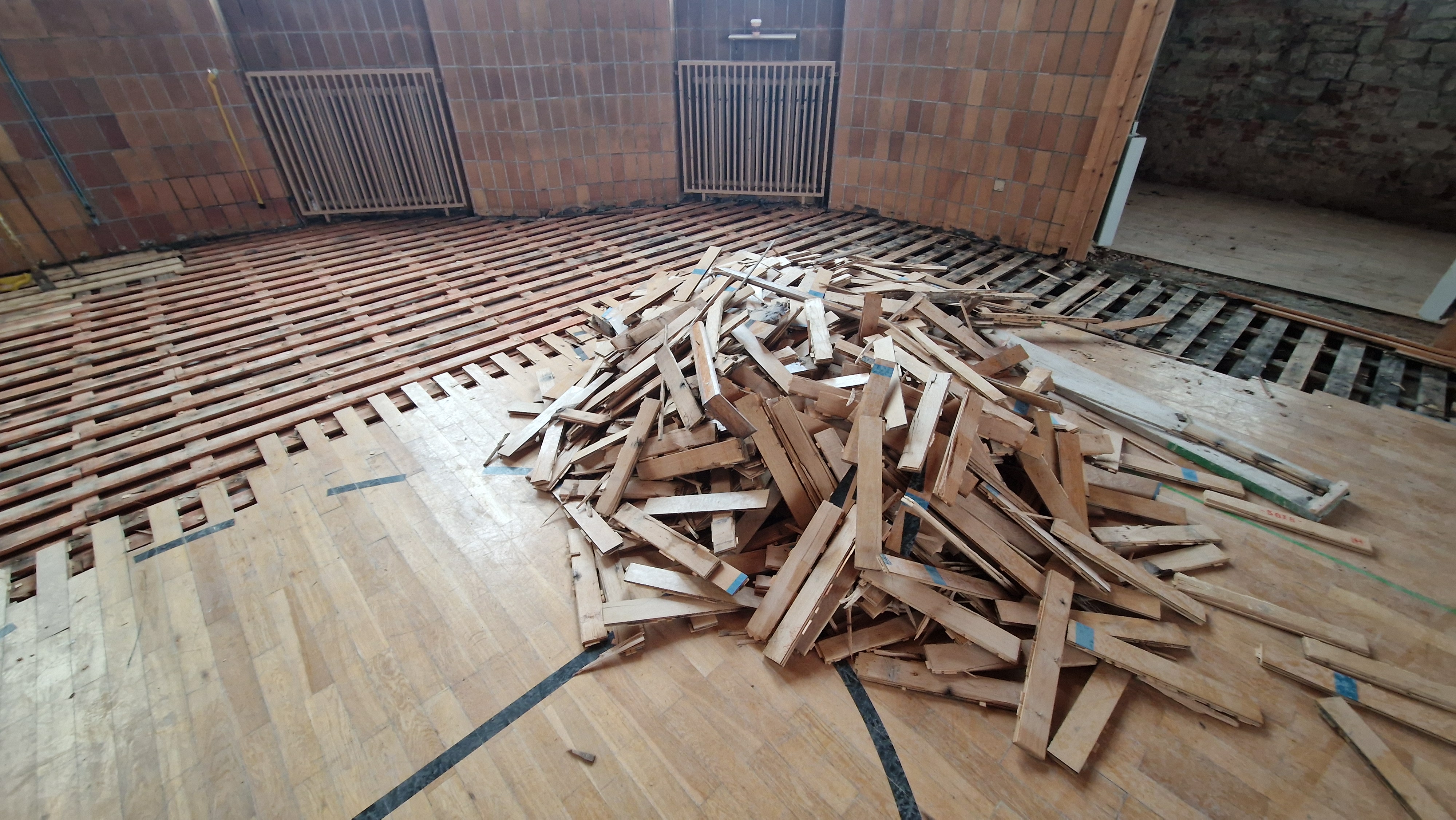 Acht Monate nach dem Wasserschaden in der Turnhalle wird der alte Boden abgetragen. Die Arbeiten im 1. OG im "Mädchentrakt" beginnen.