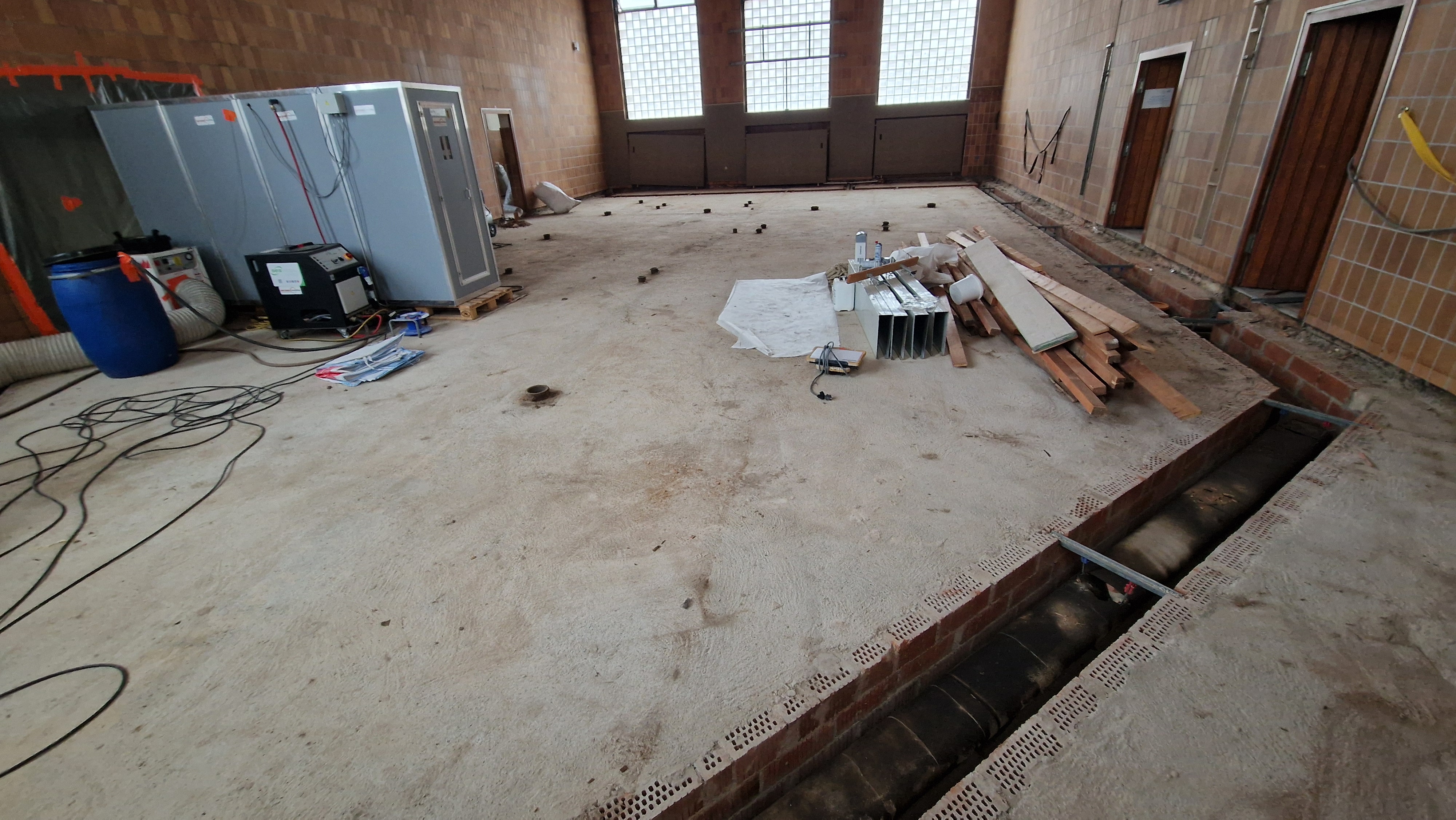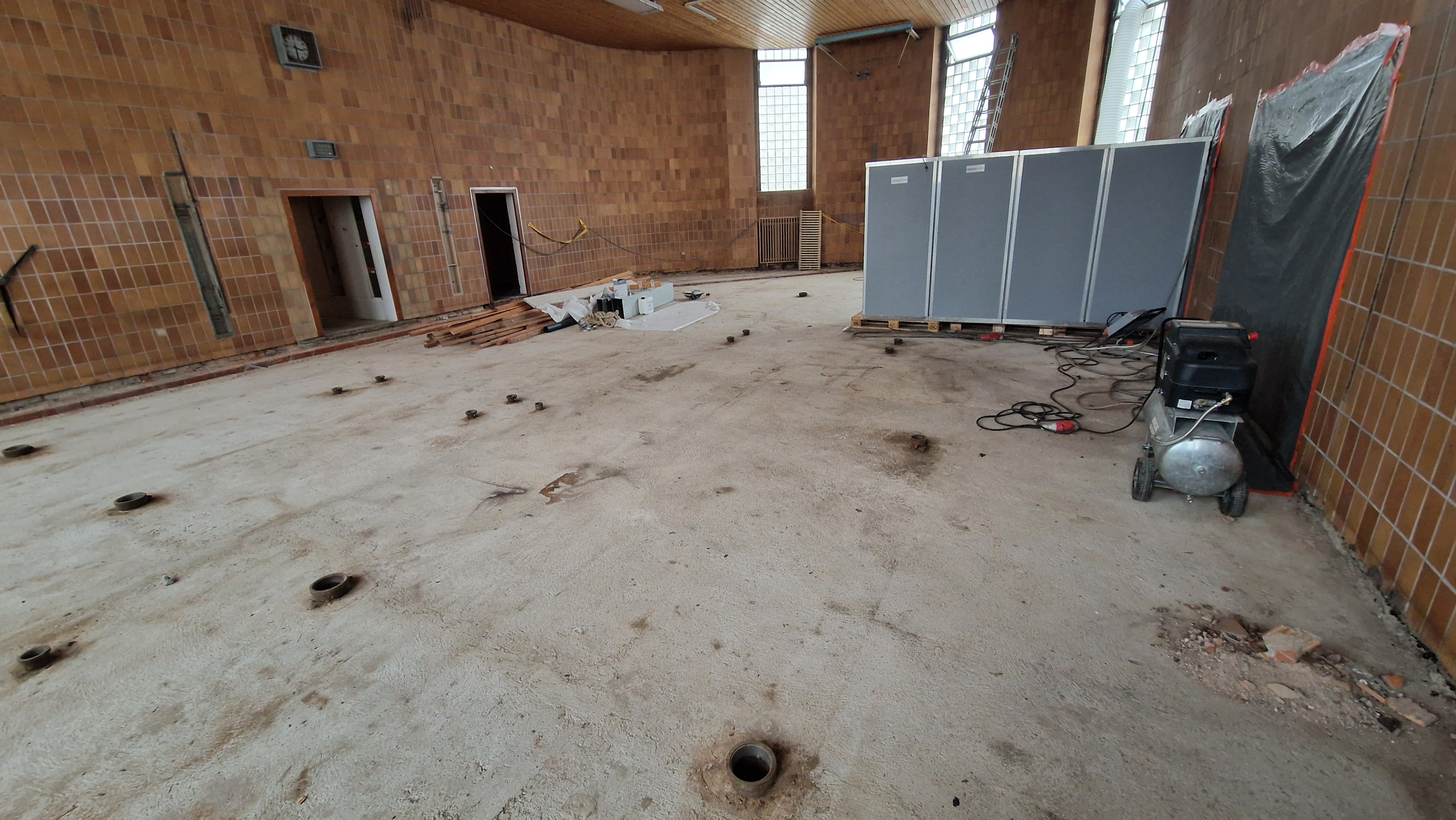 Während der Bezug der Klassenzimmer im Jungentrakt sich voraussichtlich bis Anfang November hinauszögert, beginnt der Bauabschnitt "Kellergeschoss", wo die maroden Umkleidekabinen der Turnhalle instand gesetzt werden.
