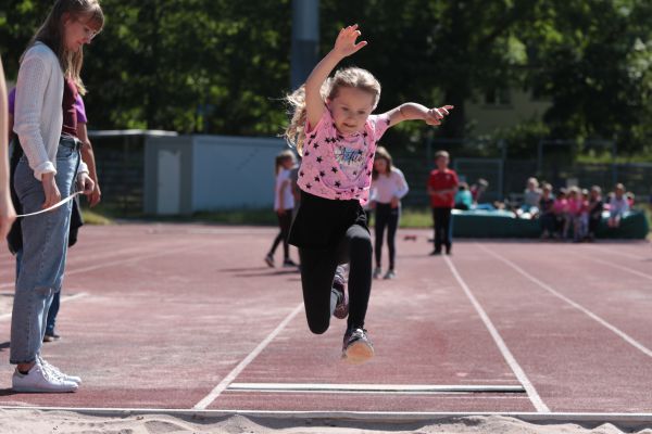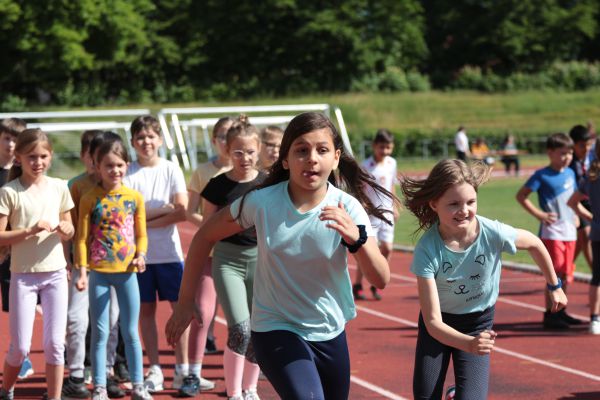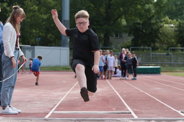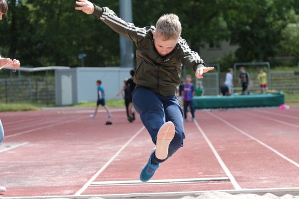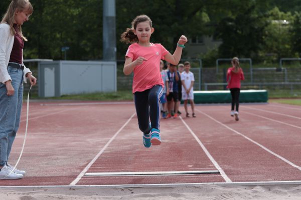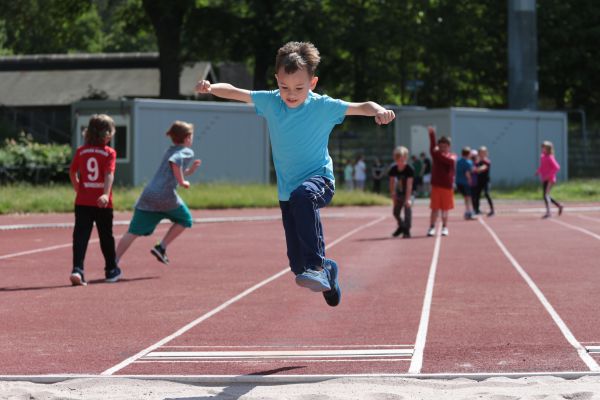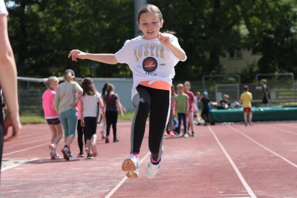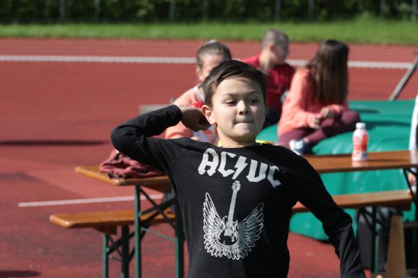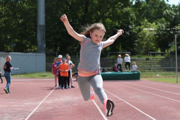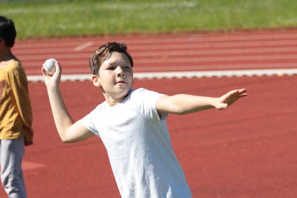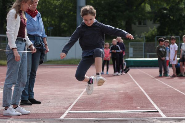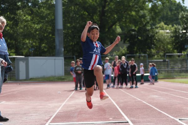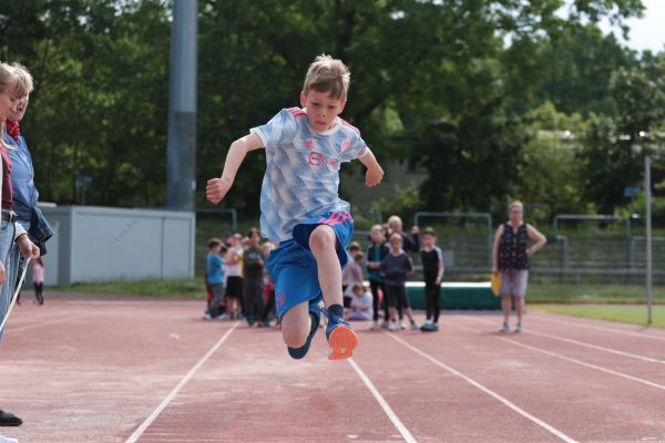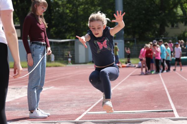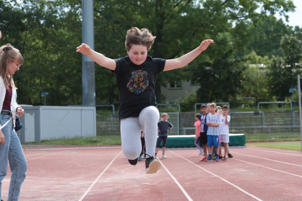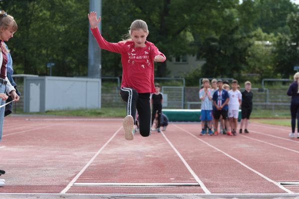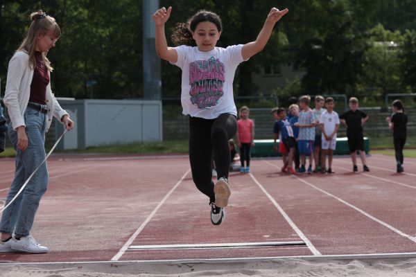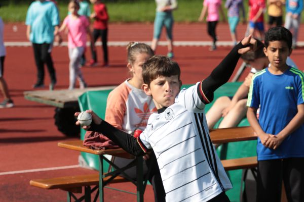Alle Klassen von der 1. - 4. Jahrgansstufe gaben in den Disziplinen 50m-Sprint, Weitwurf mit dem 80g-Ball sowie Weitsprung ihr Bestes, feuerten sich gegenseitig lautstark an und feierten ihre tollen Leistungen.