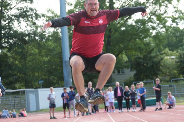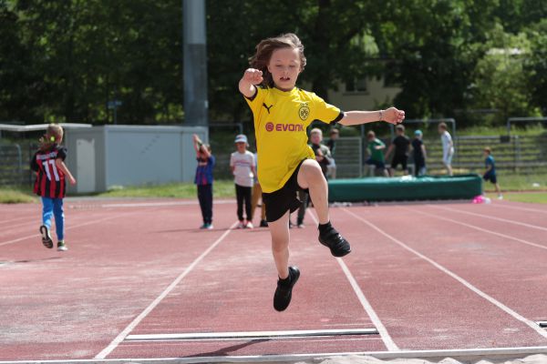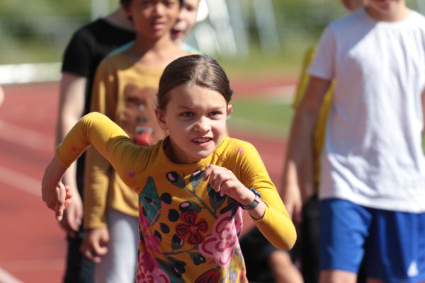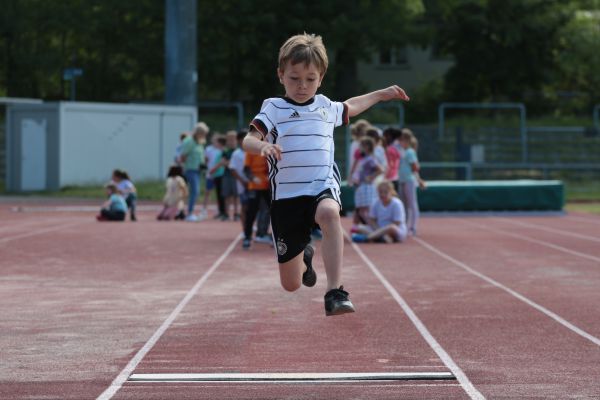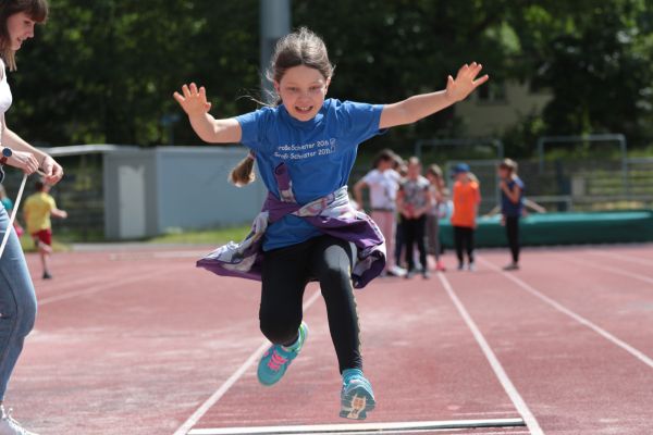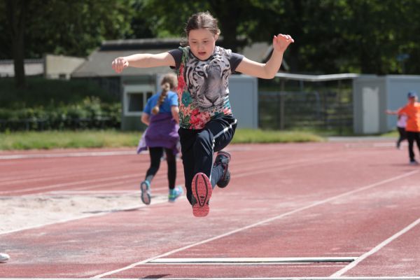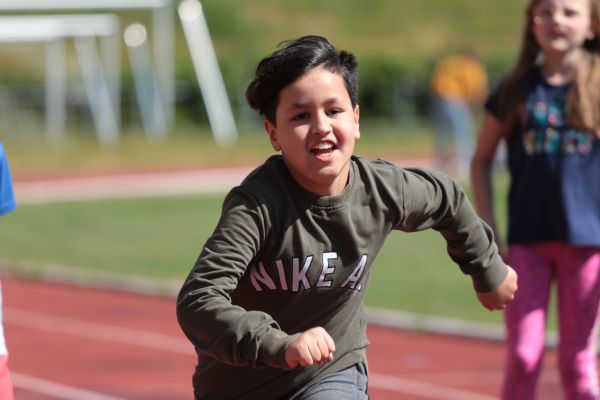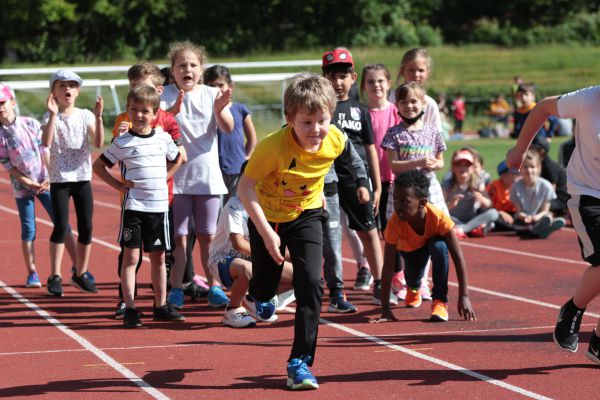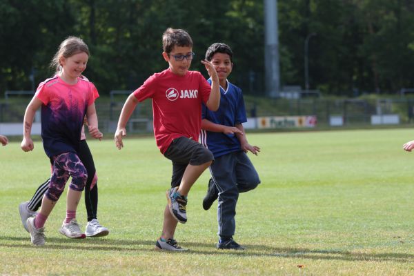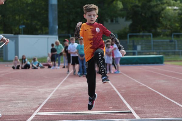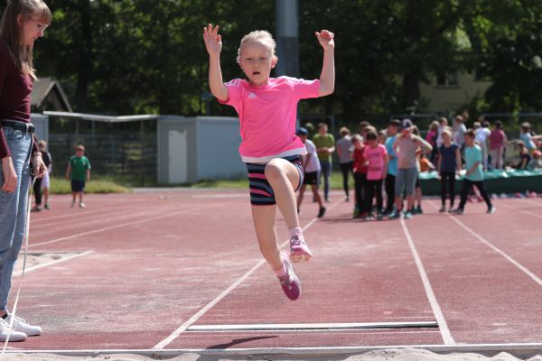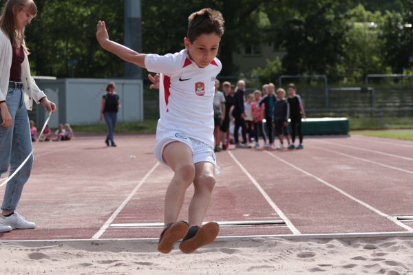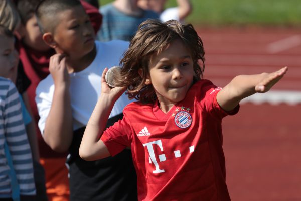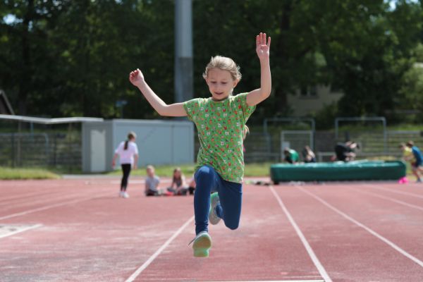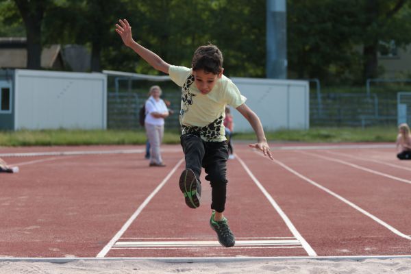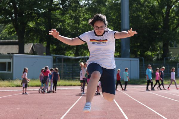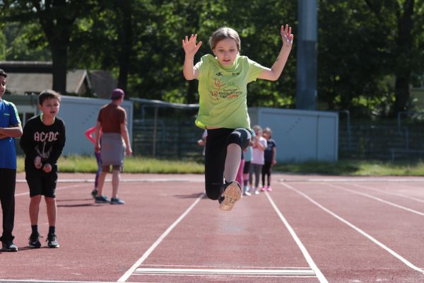 Alle Klassen von der 1. - 4. Jahrgansstufe gaben in den Disziplinen 50m-Sprint, Weitwurf mit dem 80g-Ball sowie Weitsprung ihr Bestes, feuerten sich gegenseitig lautstark an und feierten ihre tollen Leistungen.
