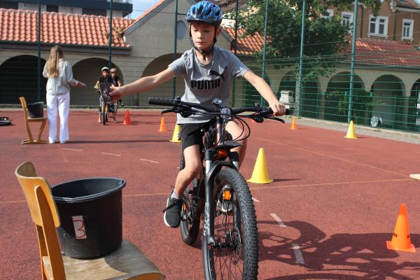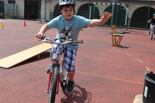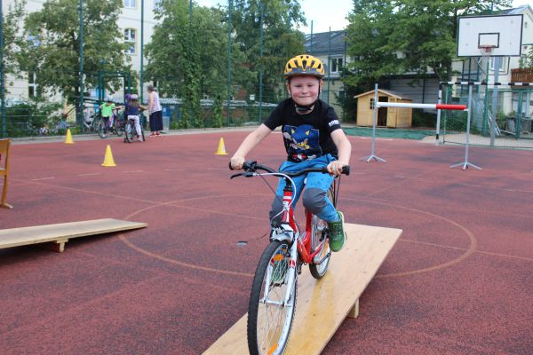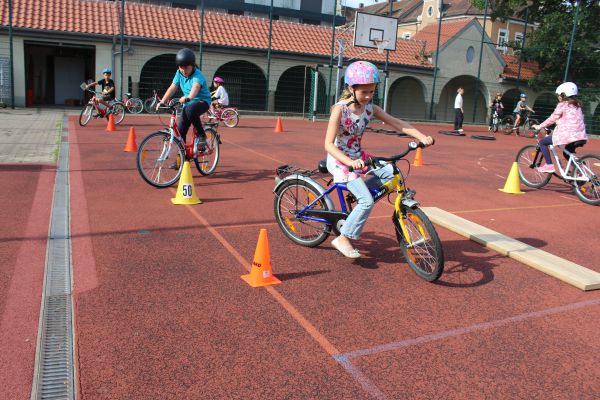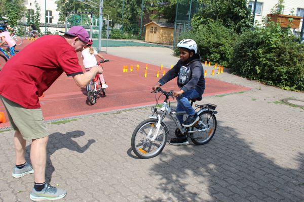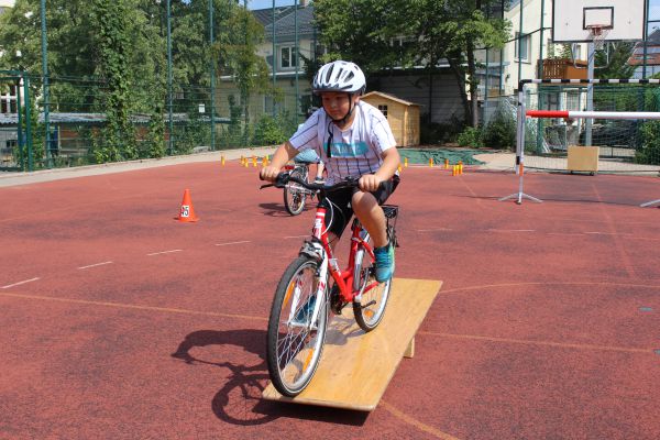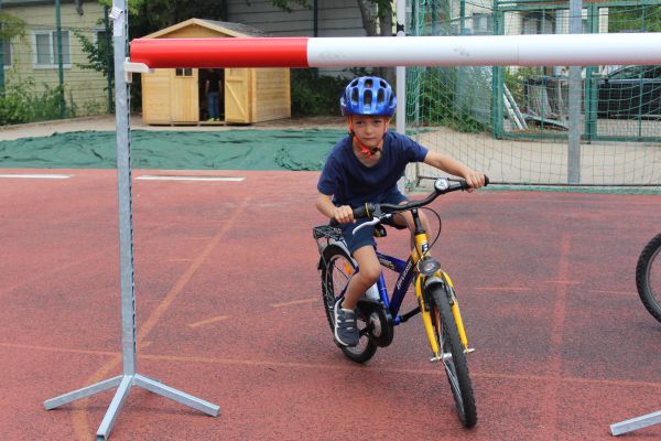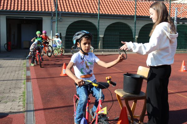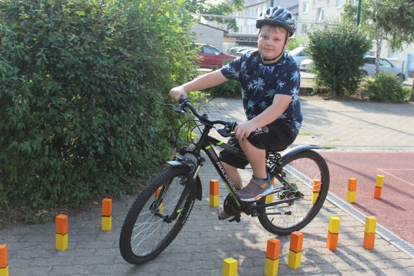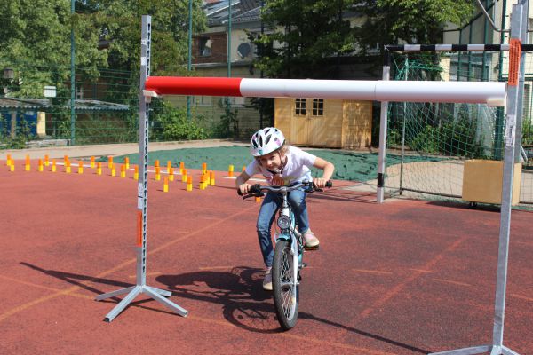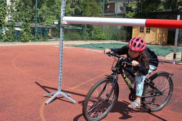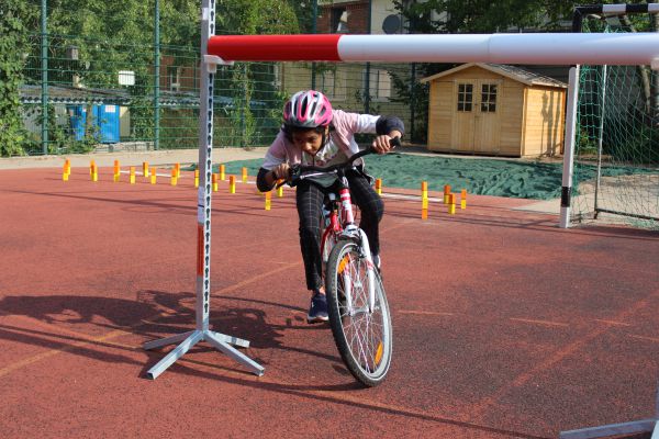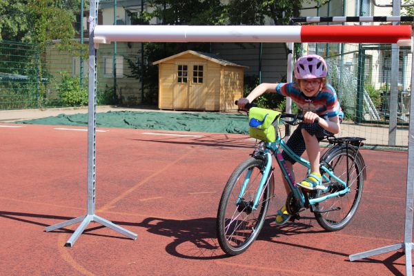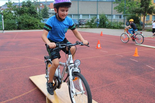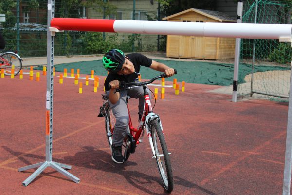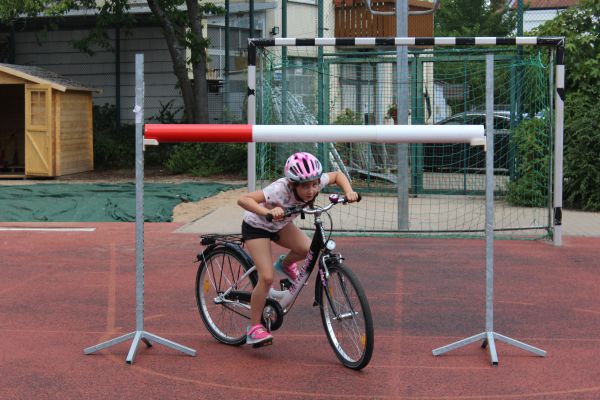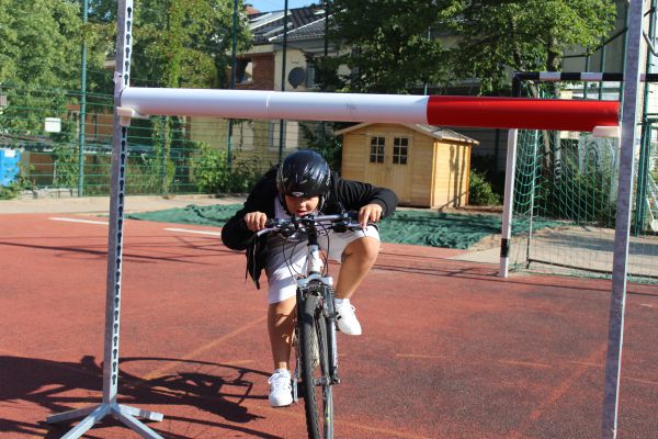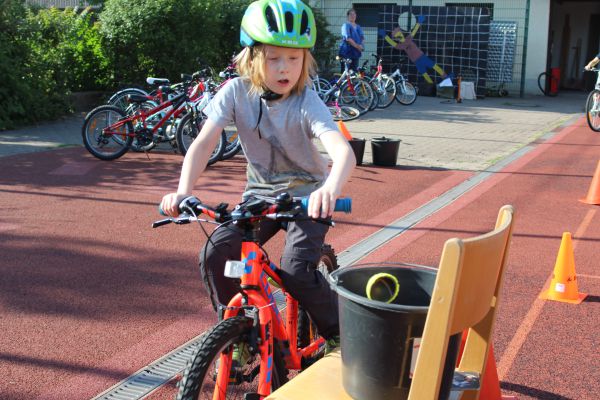 Auf dem roten Hartplatz war dafür für die Kinder ein Parcours aufgebaut, an dem sie allerhand Fertigkeiten üben konnten, die für ein sicheres Fahren auf dem Drahtesel notwendig sind. Angefangen vom einhändigen Fahren als Vorbereitung für das Handzeichen zum Abbiegen bis über den Schulterblick und das Fahren über unebene Straßen bis hin zu dem gebückten Durchfahren eines Hindernisses.