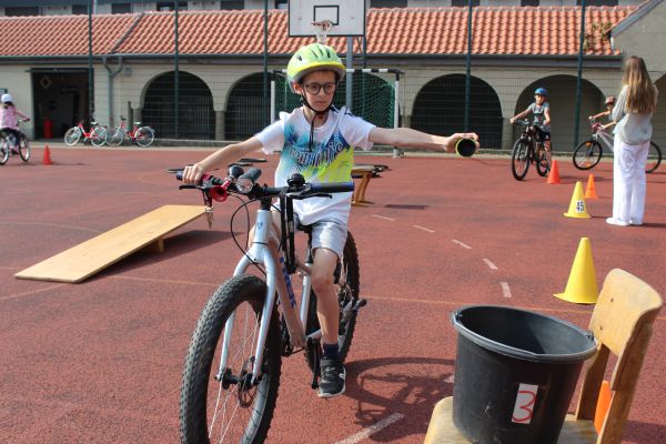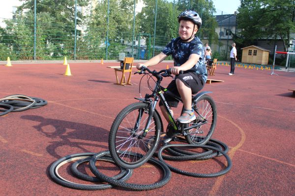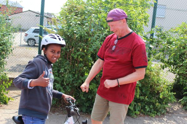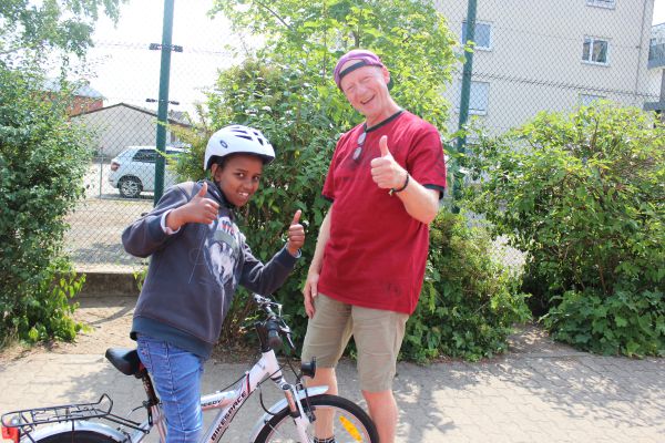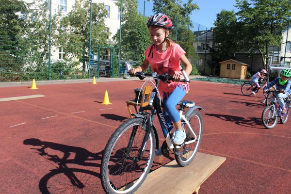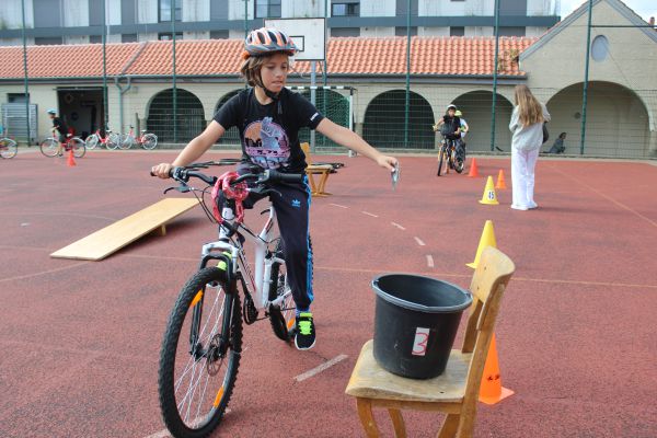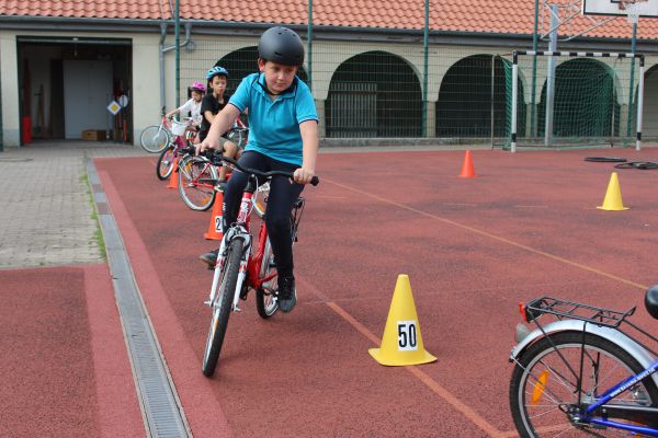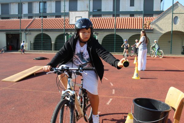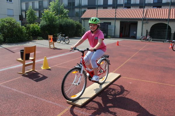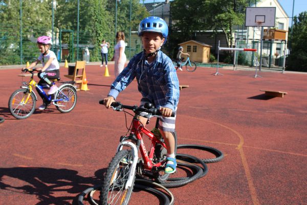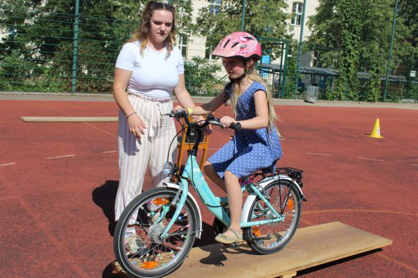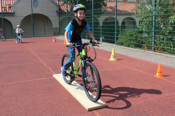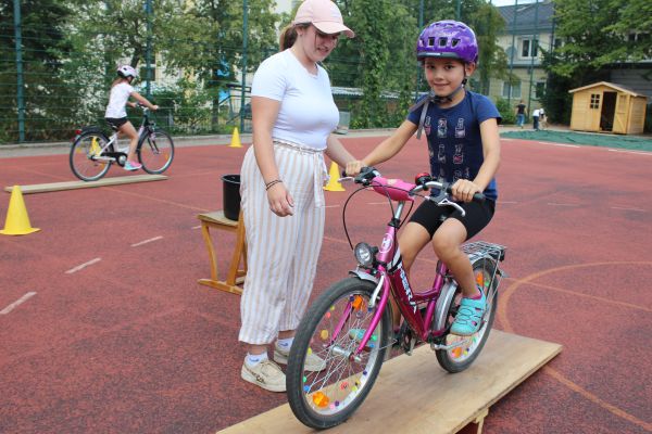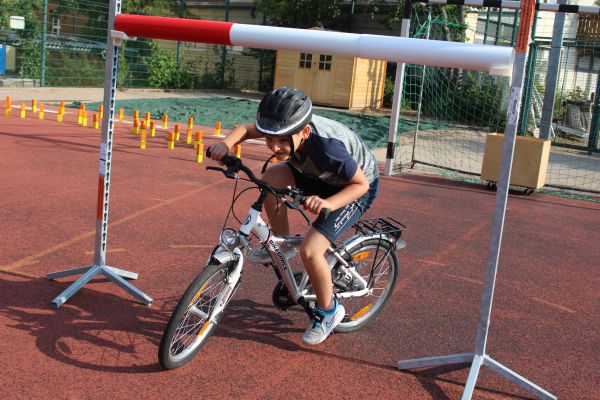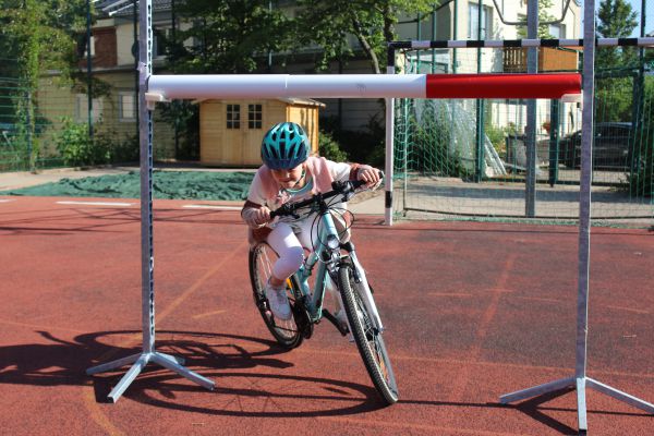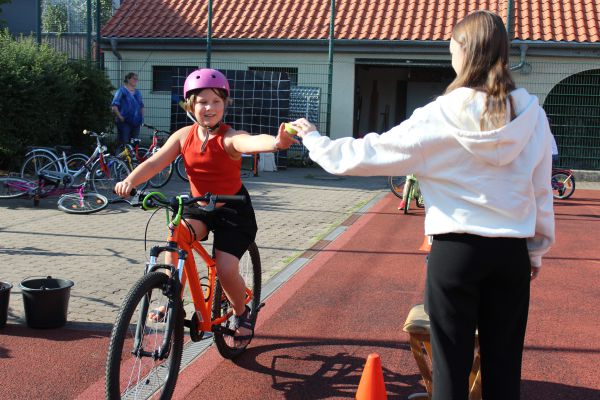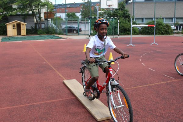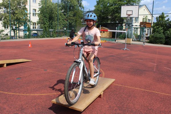 Auf dem roten Hartplatz war dafür für die Kinder ein Parcours aufgebaut, an dem sie allerhand Fertigkeiten üben konnten, die für ein sicheres Fahren auf dem Drahtesel notwendig sind. Angefangen vom einhändigen Fahren als Vorbereitung für das Handzeichen zum Abbiegen bis über den Schulterblick und das Fahren über unebene Straßen bis hin zu dem gebückten Durchfahren eines Hindernisses.