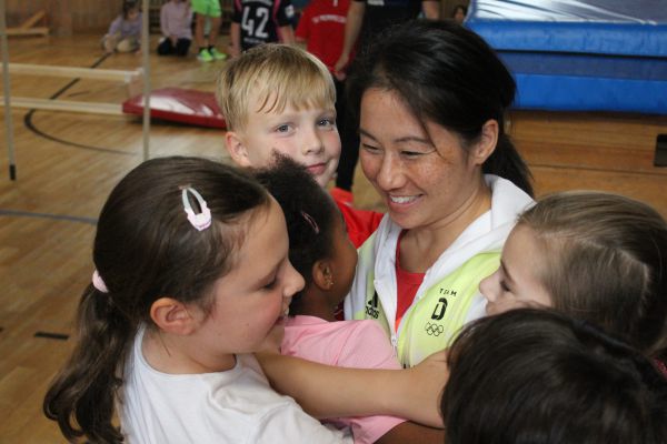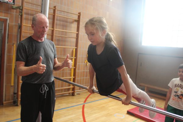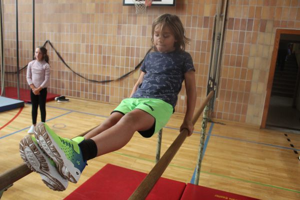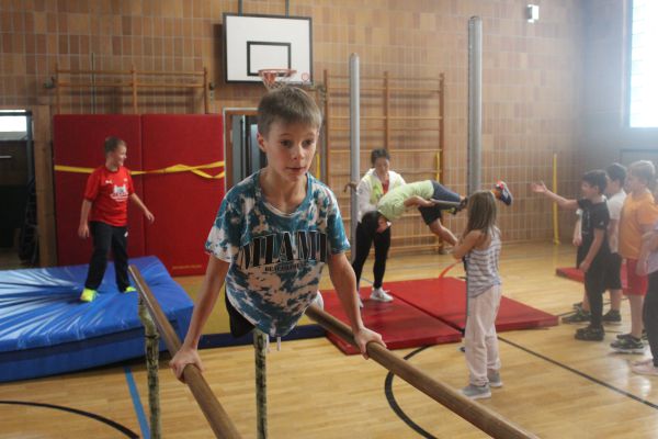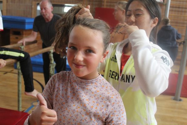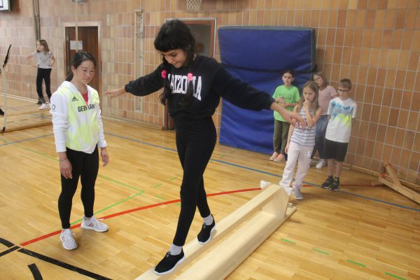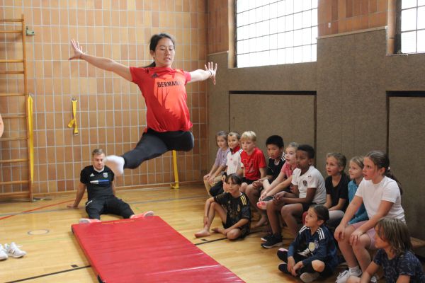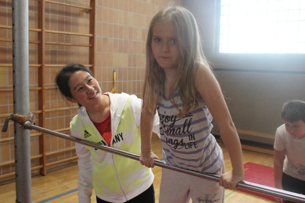 Nachdem sie sich vorstellte und uns aus ihrem Leben ein bisschen erzählte, durften wir mit ihr turnen. Zuerst präsentierte Kim Bui uns jedes einzelne Turngerät wie den Barren, das Reck, die Seile, den Schwebebalken und das Trampolin. Danach führte sie einige Übungen vor, die uns ganz schön ins Staunen versetzt haben. Mit großem Mut und viel Kraft versuchten wir die Übungen der tollen Gymnastin nachzumachen.