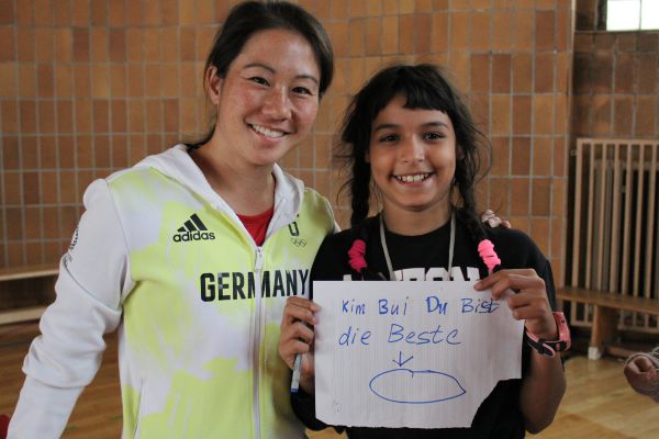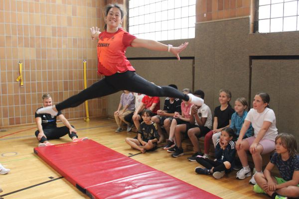 Zum Abschluss verzauberte uns Kim Bui mit unvorstellbaren Übungen wie einem freien Rad, einem dreifachen Flick-Flack oder auch einem Rückwärtssalto. Die verbrachte Stunde mit ihr konnte nicht besser enden als mit Autogrammen, Fotos und einer unterschriebenen Erinnerungskarte. Es war ein tolles Erlebnis Kim Bui zu treffen und von ihr etwas zu lernen. von Iulia, 4a