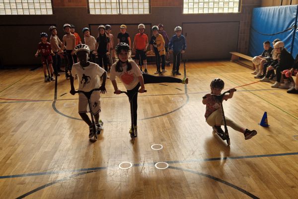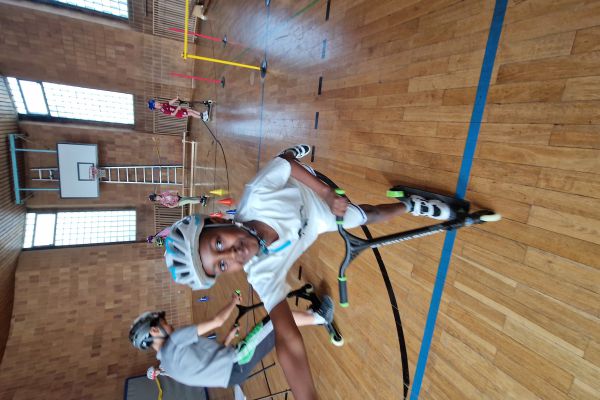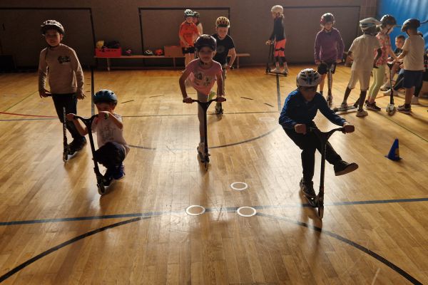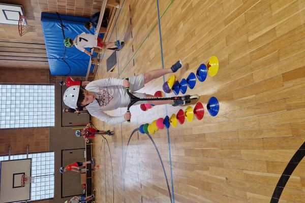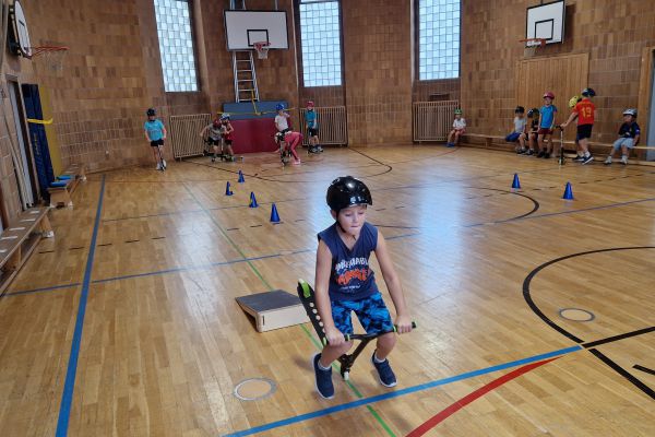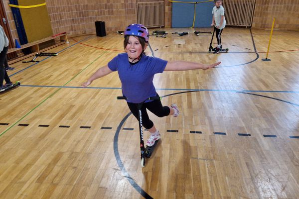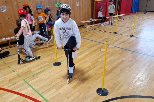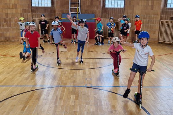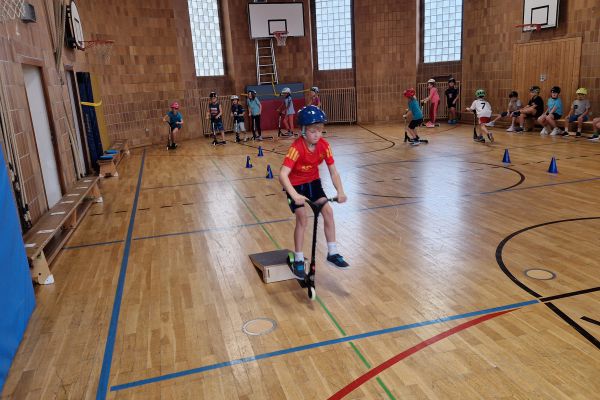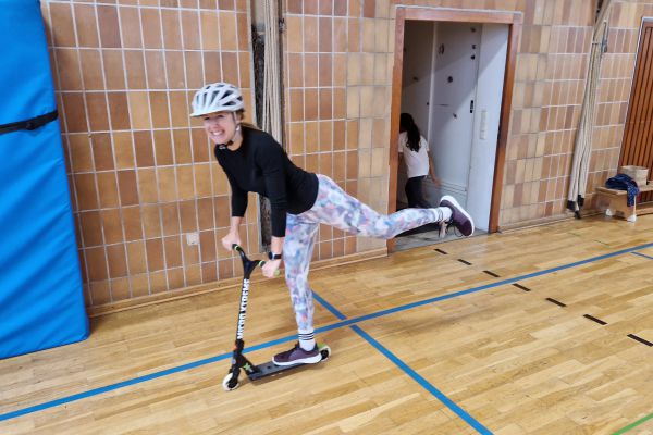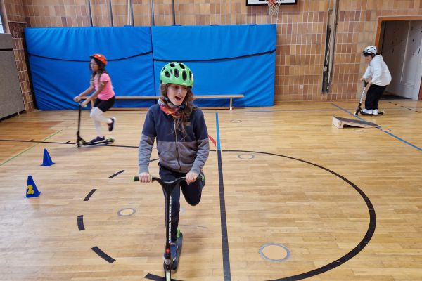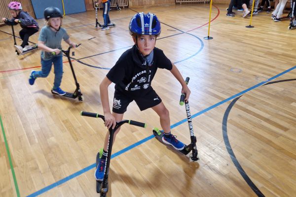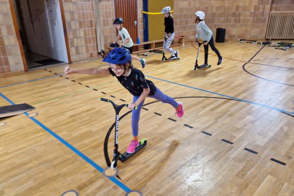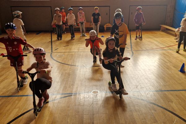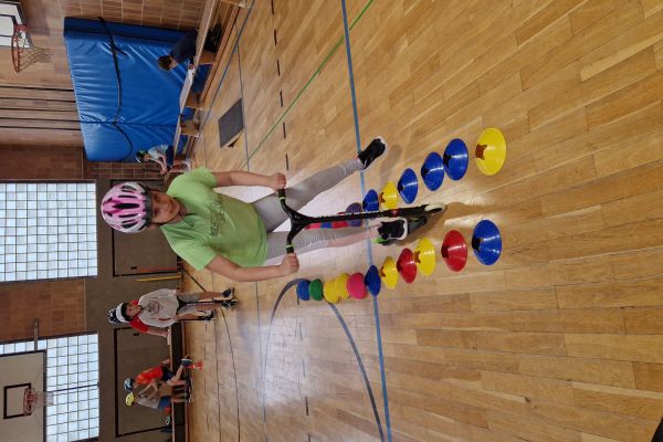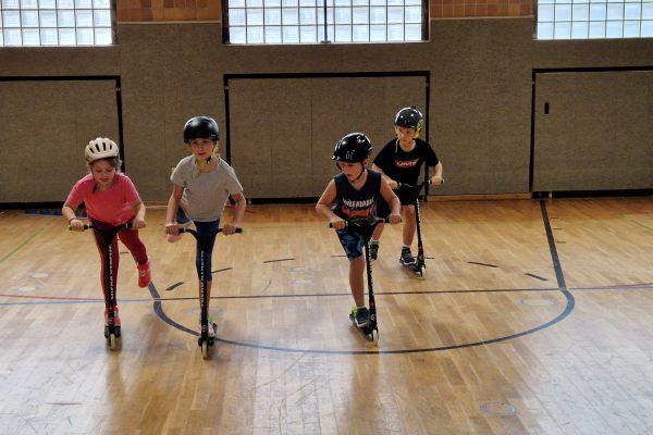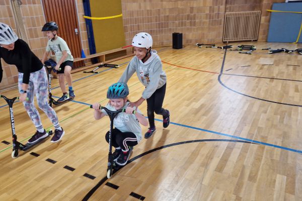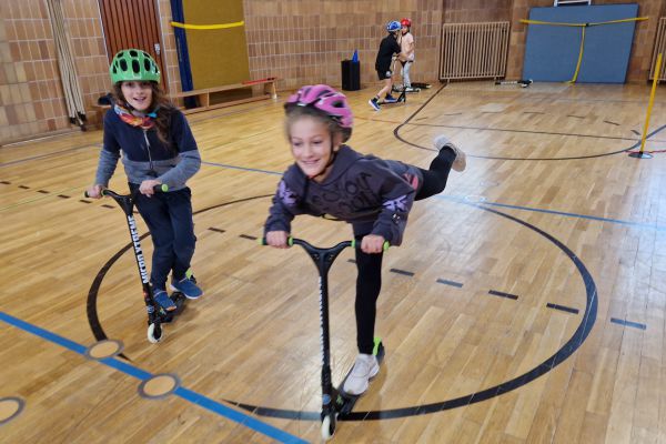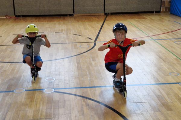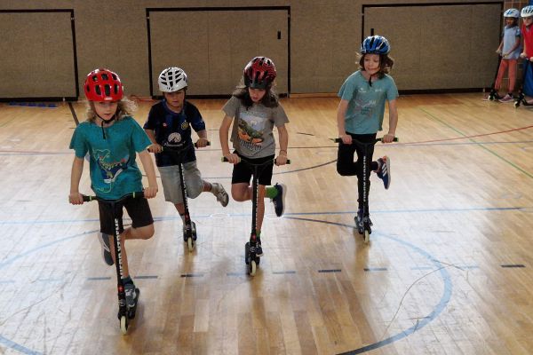 Gemäß unseres Leitbildes "In Sicherheit die Welt entdecken" können wir nun neben den Schonraumübungen auf dem Fahrrad auch schon üben, sicher mit dem City-Roller zu fahren. Dabei kommt es zunächst auf das richtige Tempo und die richtige Bremstechnik an. Darüber hinaus macht Rollerfahren aber auch einfach Spaß und so mancher Trick ist schnell gelernt.