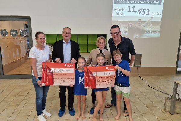 Alle teilnehmenden Kinder belehrten das Bamberger Stadtoberhaupt eines Besseren. Schließlich steuerten allein wir Wunderburger schon stolze 910 Bahnen bei, um unter tosendem Jubel am Ende der Veranstaltung schließlich das herausragende Ergebnis von 11453 Bahnen zu erreichen. Herr Starke gab sich nicht nur geschlagen, sondern überreichte dem Kinderschutzbund, vertreten durch Frau Ackermann, äußerst gerne in der Summe einen Geldbetrag von sage und schreibe 1900 Euro. Neben den beiden Wettpaten, die jeweils 750 Euro einlösten, spendeten einige teilnehmende Schulen auf freiwilliger Basis zusammen weitere 400 Euro, so dass eine Spende zusammenkam, über die sich der Kinderschutzbund richtig freuen konnte.