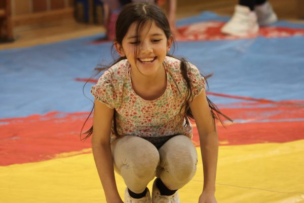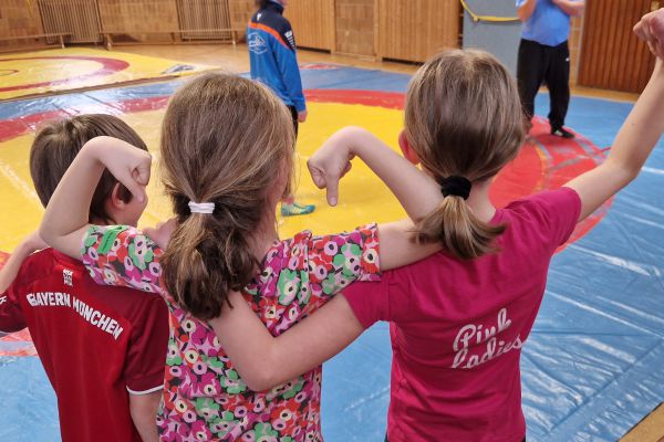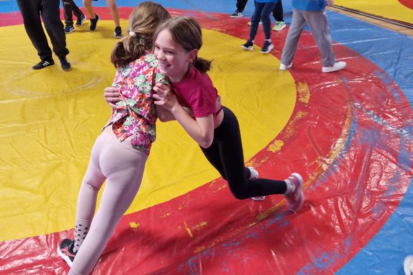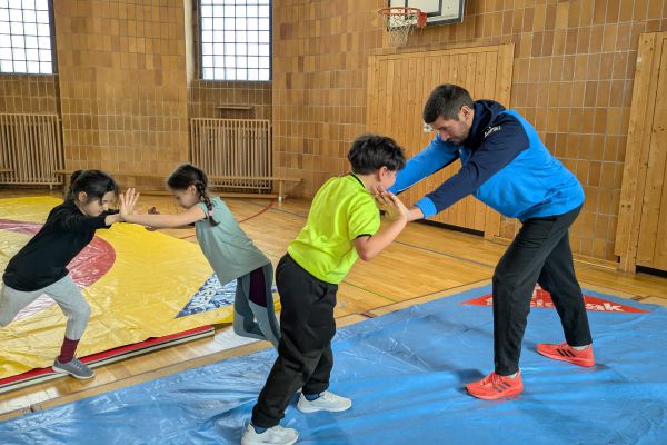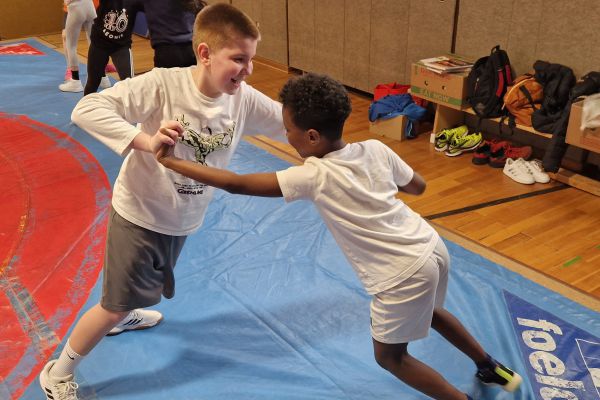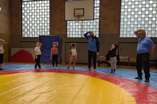 Gemeinsam verwandelten sie die Turnhalle in eine Ringer-Arena, in der die Kinder lernten, wie man mit einer Brezel andere auf die Schulter legen kann oder wie ein einfacher Griff an die Ferse ausreicht, um jemanden auf die Matte zu zwingen. Natürlich ist Ringen ein Kampfsport, doch bei allen Übungen standen Fairness und Achtsamkeit, niemanden zu verletzen, ganz oben auf der Liste der wichtigsten Dinge, die von allen beachtet werden mussten.