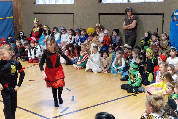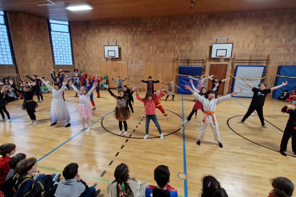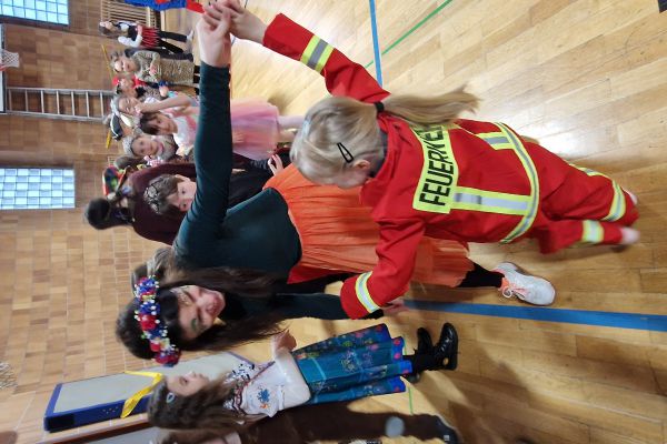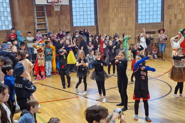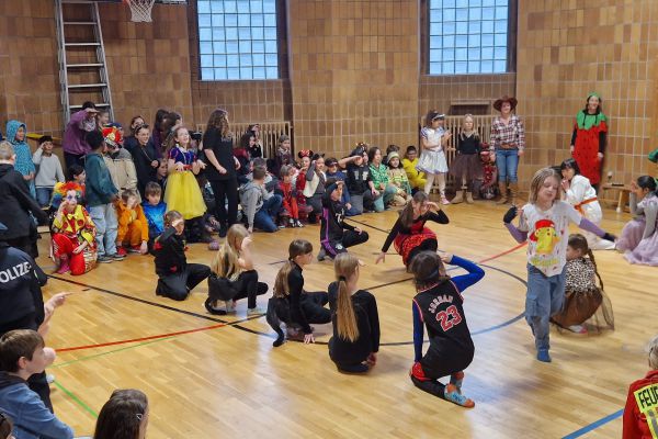 Um 9 Uhr versammelten sich alle Feierwütigen in der Turnhalle, wo einige Klassen zunächst unter der Leitung von Frau Königer stimmungsvolle Faschingslieder schmetterten, ehe die Tanz-AG unter der Leitung von Frau Stier die Kinder zum Brodeln brachte