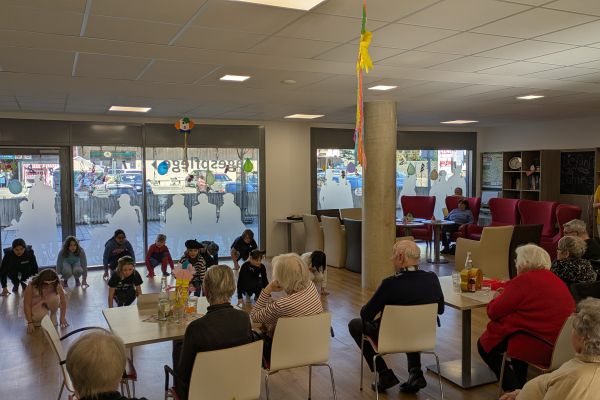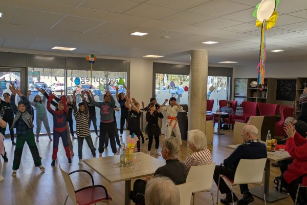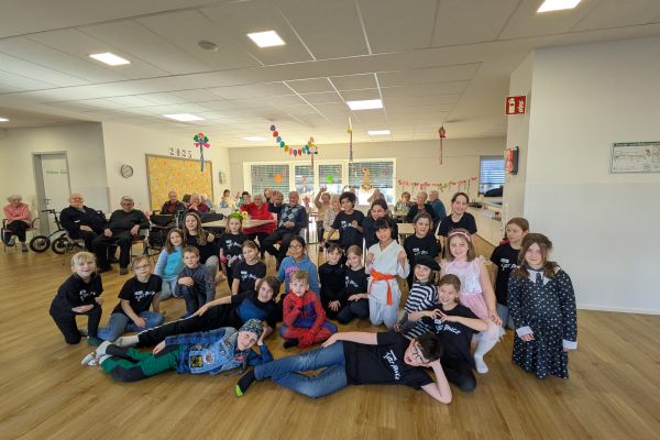 Die Schülerinnen und Schüler der Tanz-AG der Grundschule Wunderburg traten mit zwei stimmungsvollen Tänzen vor den Gästen der Tagespflege erneut auf. Es war eine wahre Freude für die Gäste, die verkleideten Schüler und Schülerinnen tanzen zu sehen. Die mitreißende Musik und die bezaubernden Bewegungen der Kinder steckten selbst die ältere Generation noch zum Klatschen und Schunkeln ein. Natürlich gehört zu einer gelungenen Faschingsaufführung auch eine Polonaise, welche sich durch das ganze Quartiersbüro zog. Zur Belohnung gab es von den Mitarbeiterinnen des Quartiersbüro sogar noch etwas Süßes mit auf den Weg. Mit einem kräftigen "Helau!" verabschiedete sich die Wunderburgschule lautstark von den Senioren und Seniorinnen.