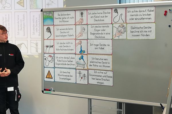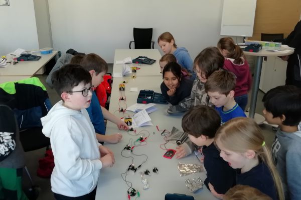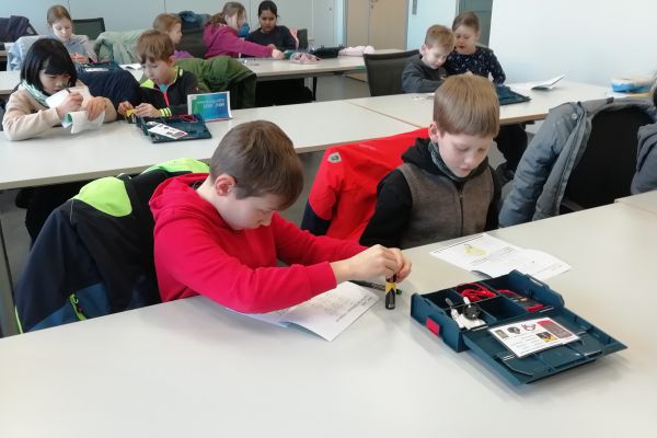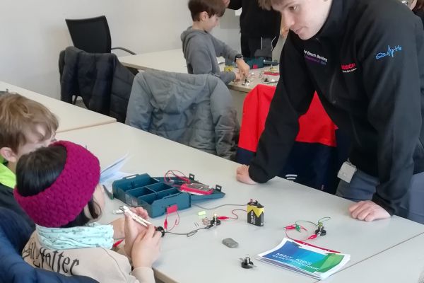 Am Dienstag, 18.2.2025, besuchten wir die Firma Bosch. Wir wurden herzlich von zwei Personen empfangen. Sie führten uns zu unserem eigenen Experimentierraum. Dort stellten sich die vier Azubis der Firma Bosch vor und begrüßten uns. Wir wurden in Zweier-Gruppen eingeteilt, die je einen Kasten mit Gegenständen bekamen, um damit Stromkreise zu bauen. Dann bekamen wir ein Übungsheft zum Thema Strom. Schon gab es die erste Aufgabe. Die Azubis zeigten uns Bilder und wir mussten herausfinden, welcher Text zu den Bildern passt. In welcher Position leuchtet die Glühlampe? Das war unsere zweite Aufgabe. Danach schrieben wir die verschiedenen Teile der Glühlampe auf. Endlich durften wir einen Stromkreis bauen. Wir forschten, welche Materialien den Strom leiten und welche nicht. Nach der Pause lernten wir die Reihenschaltung und die Parallelschaltung kennen und bauten sie. Dabei durften. wir auch die Spannung mit einem Voltmeter messen. Einige von uns bauten ein riesengroße Parallelschaltung. Am Ende beantworteten wir Fragen über das Gelernte. Als Abschiedsgeschenk bekamen wir ein Pixiebuch zum Thema Strom. Ich fand den Besuch bei der Firma Bosch sehr, sehr spannend und lehrreich. Das Stromkreise bauen gefiel mir besonders gut
