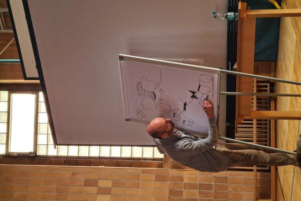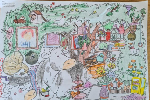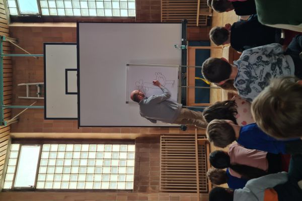 Ein echtes Highlight war, als Alexander Steffensmeier vor den Kindern zeichnete. Mit ein paar geübten Strichen entstand Lieselotte sowie andere Bauernhoftiere und sogar Lieselottes Freund der Postbote tauchte auf dem Papier auf.