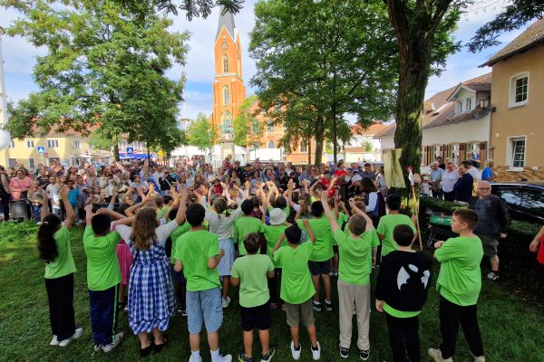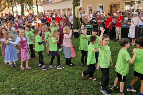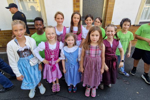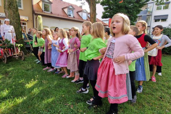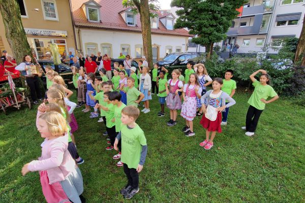 Am Montag schließlich zogen die Kinder unter der Leitung von Frau Gatnar und Frau Königer zum Hahnenschlag und begeisterten mit munartlicher Volksmusik und ihrem Straßenfeger "Die Kerwa is kumma".