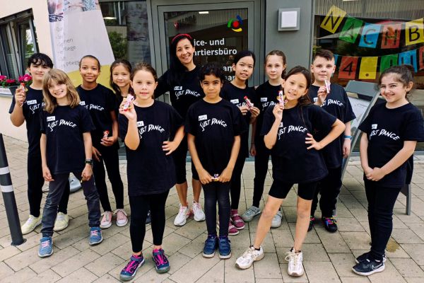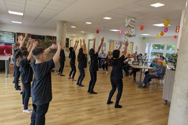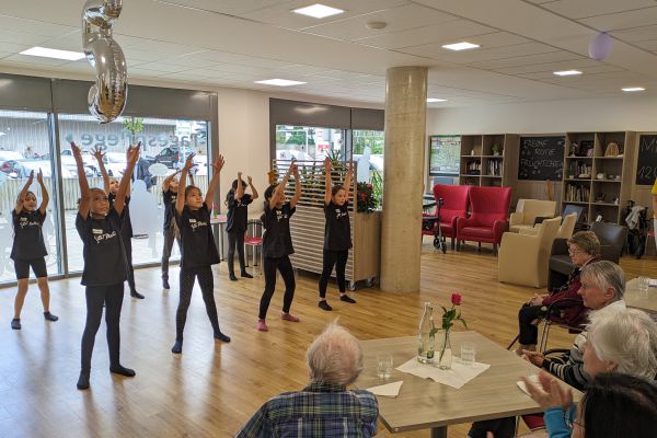 Anlässlich des fünfjährigen Jubiläums des Quartiersbüros am Ulanenpark, trat die Wunderburgschule mit ihrer Tanz-AG „WuBu Just Dance“ im Seniorenheim auf. Die Mädchen und Jungen der 3. Klassen verzauberten den Speisesaal im Nu zu einer Showbühne. Mit ihren beiden Tänzen begeisterten sie die dreißig Seniorinnen und Senioren."Für unsere Gäste der Tagespflege war der Besuch der Kinder der Wunderburgschule ein kleiner Glücksmoment.
