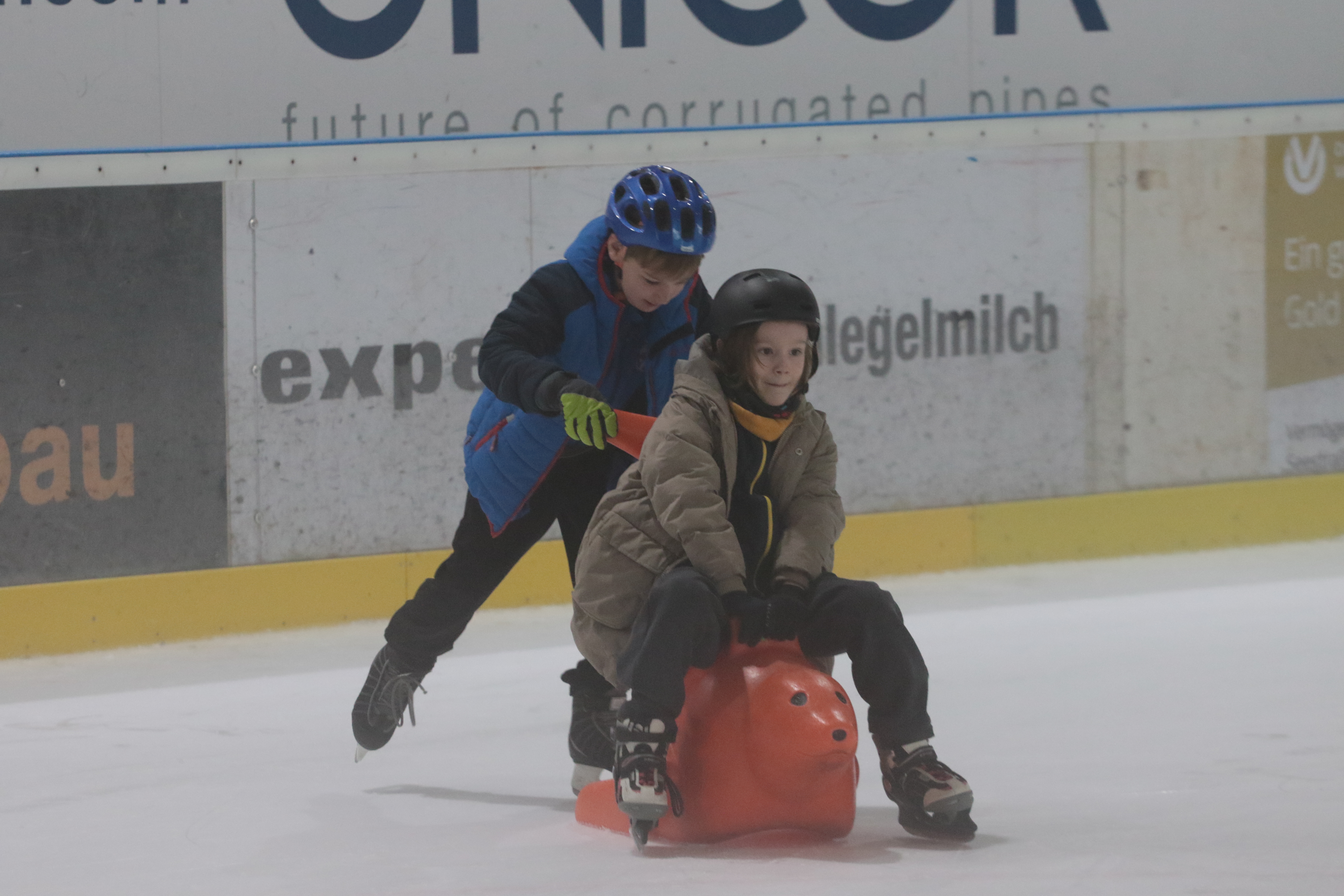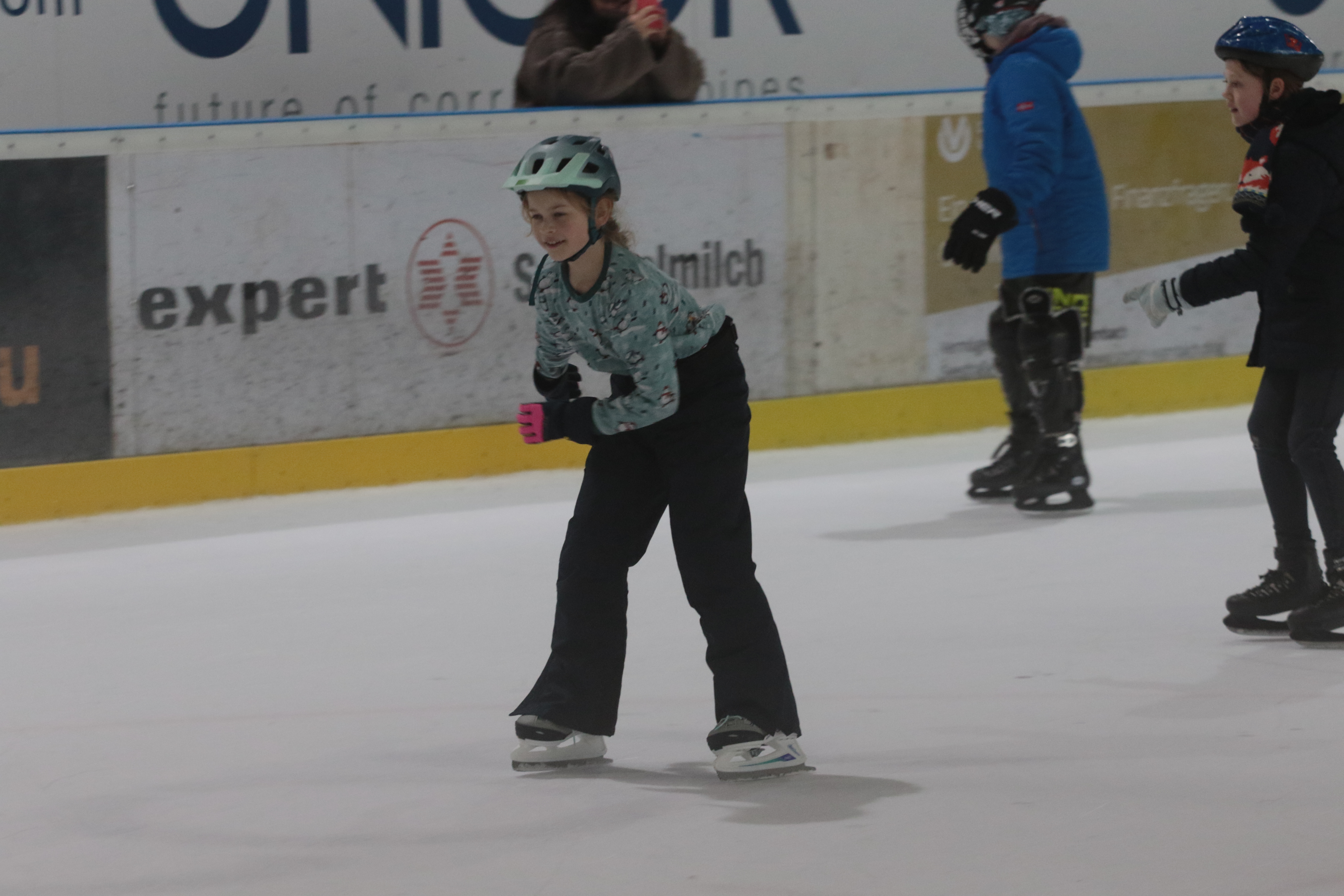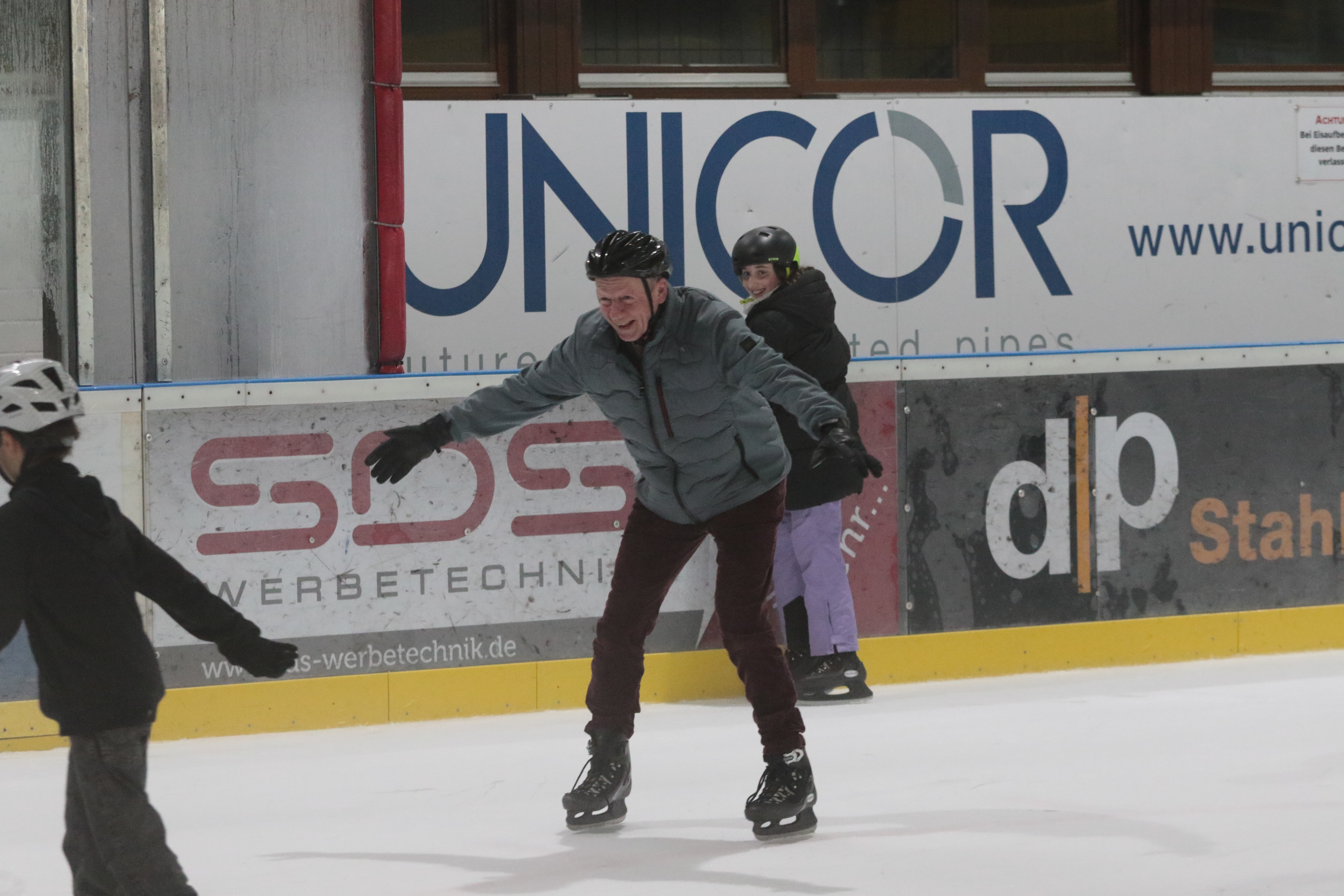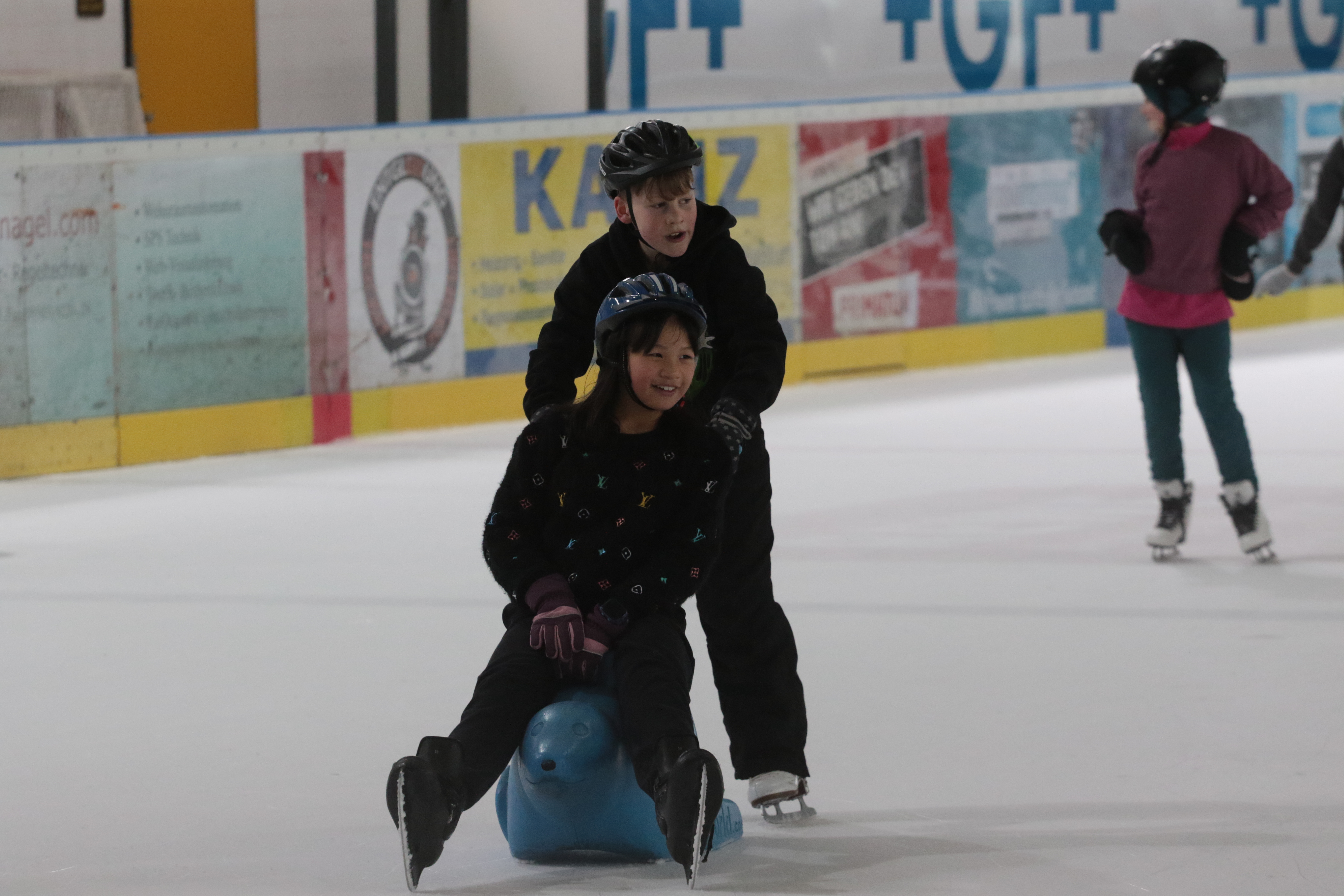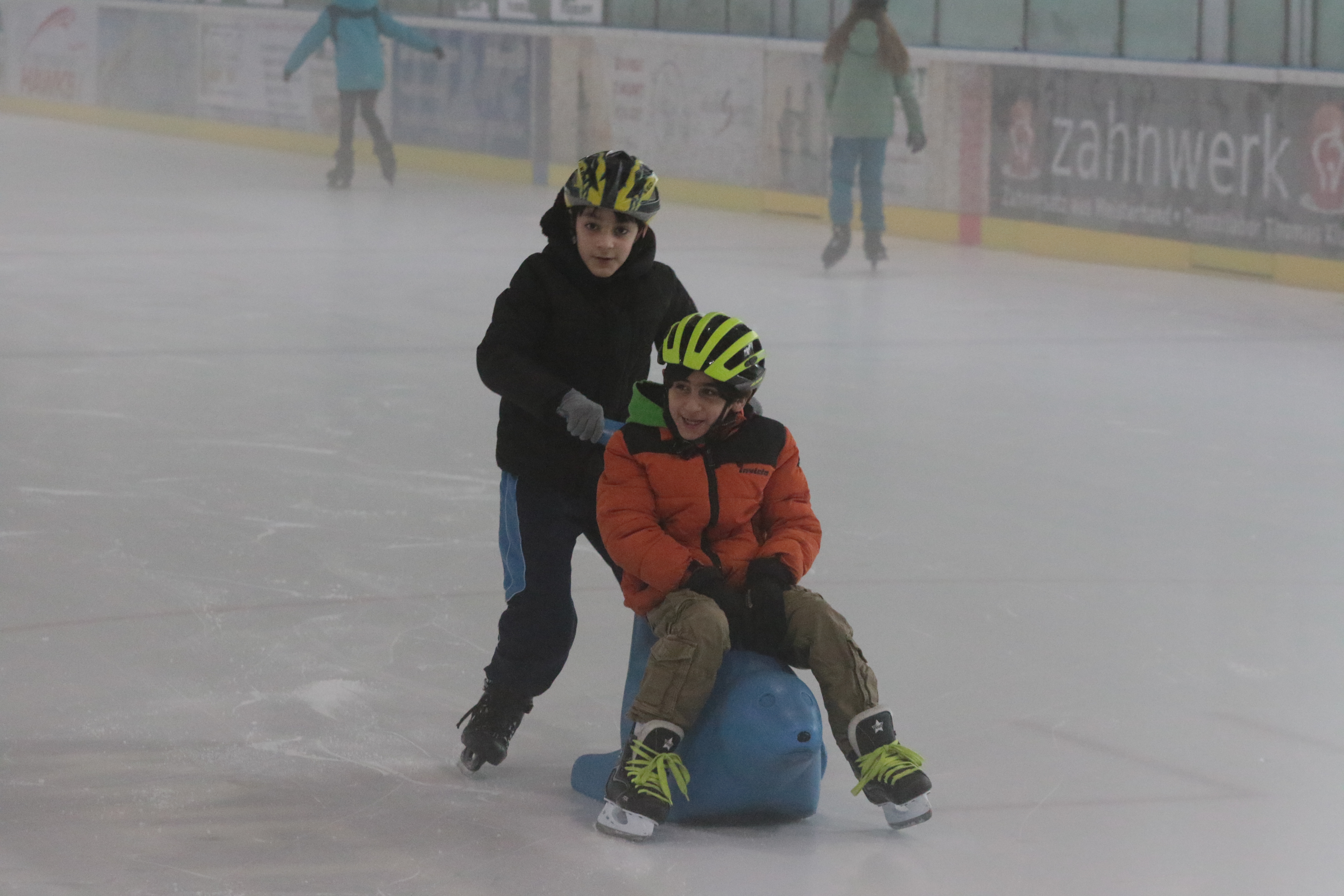 Doch selbst der ein oder andere Sturz wurde tapfer weggelächelt. Alle Kinder tobten sich auf der Eislauffläche prächtig aus, probierten kleine Kunststücke oder schnappten sich einfach Freundin oder Freund, um gemeinsam das Schlittschuhlaufen auszuprobieren.